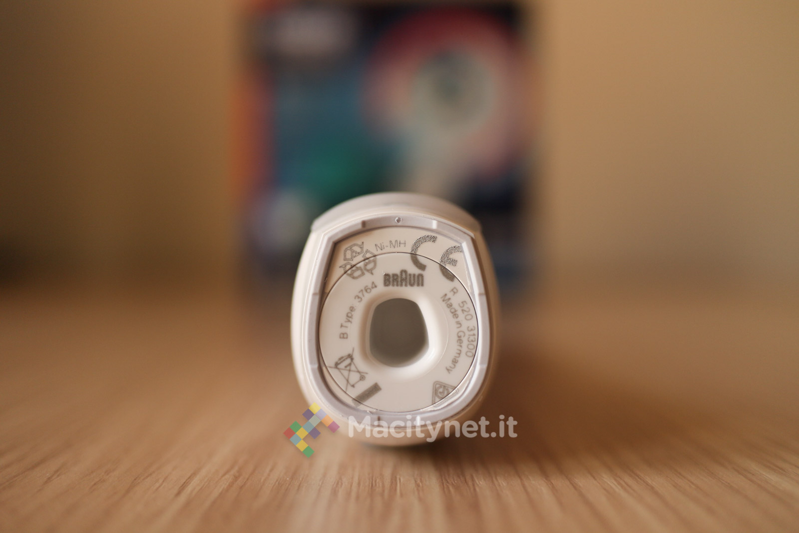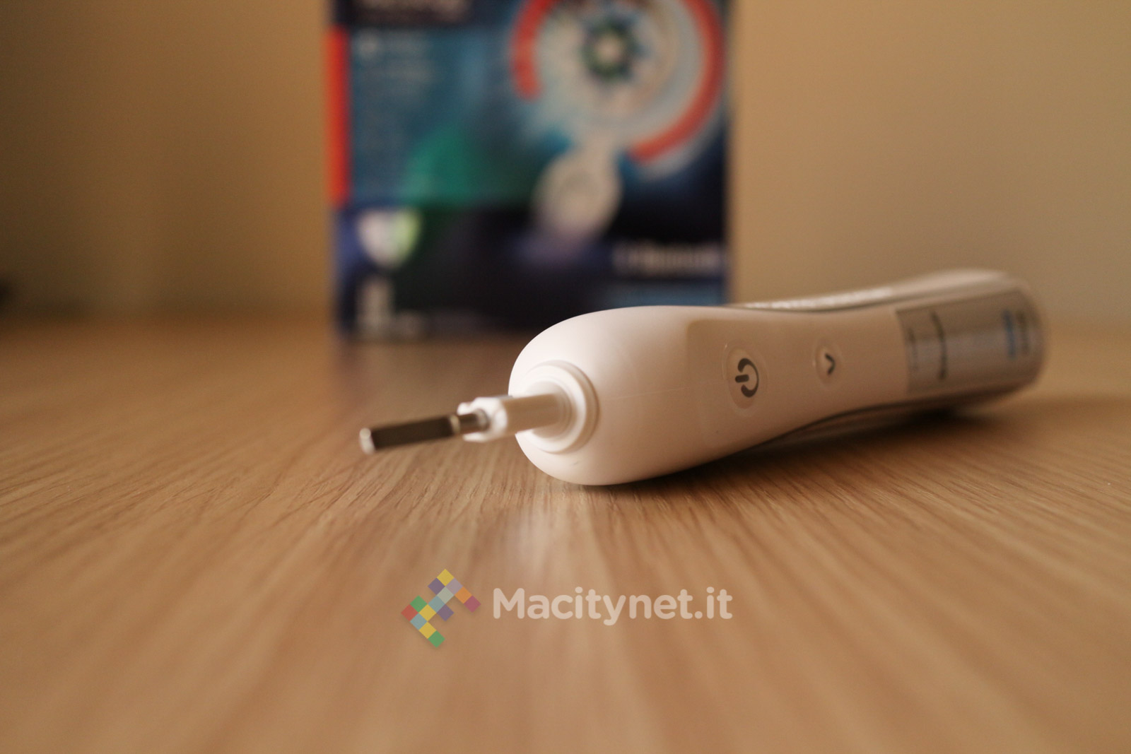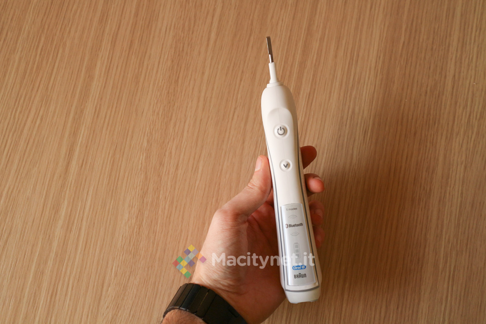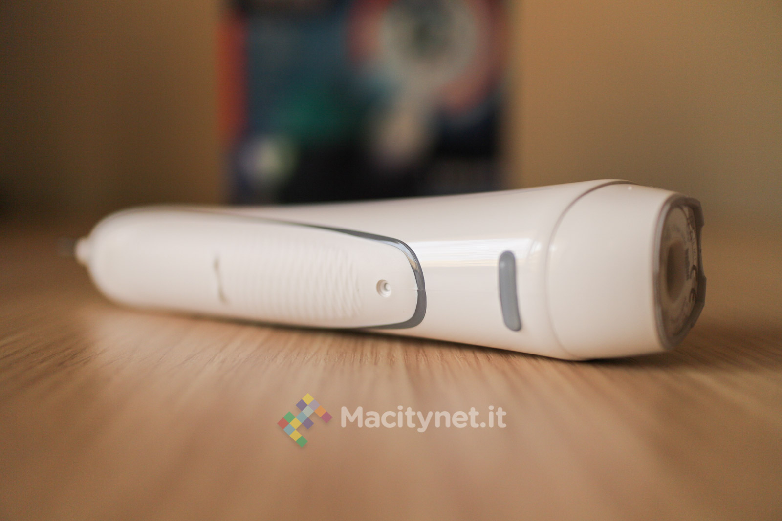 Un’ultima caratteristica che abbiamo apprezzato nell’uso dello spazzolino di Oral-B sia in modalità “indipendente”, sia in quella combinata allo smartphone, è la segnalazione luminosa posta sul retro del manico.