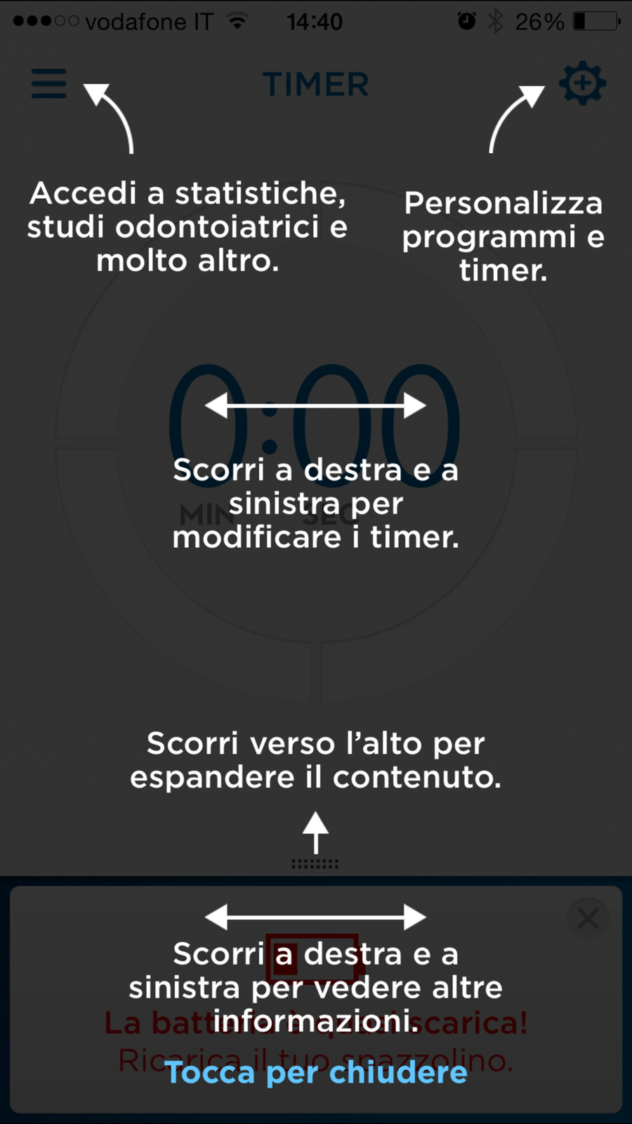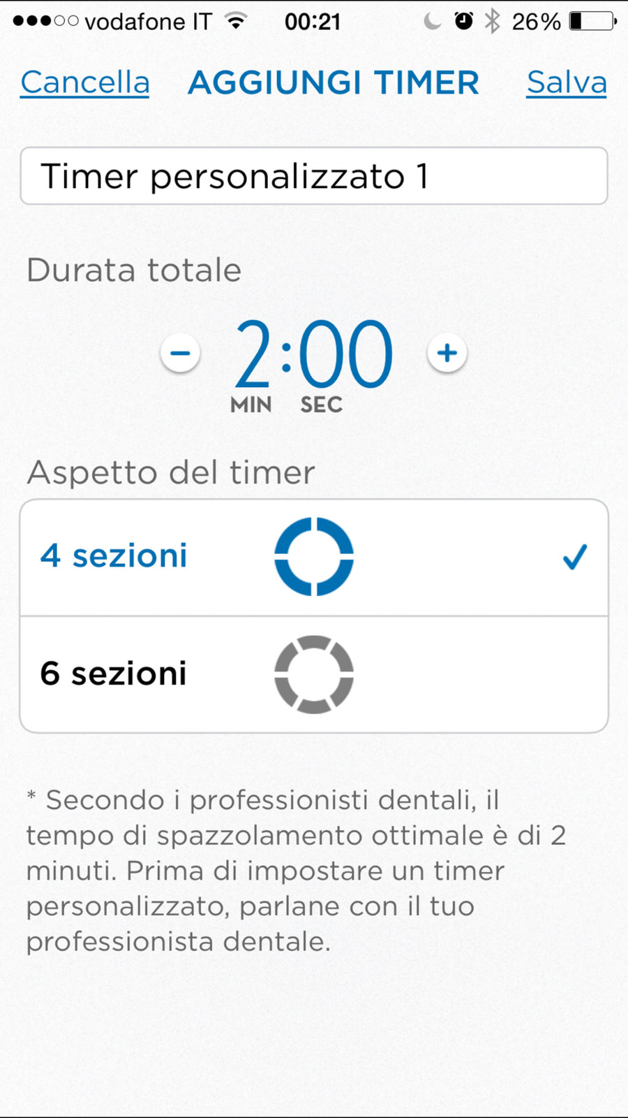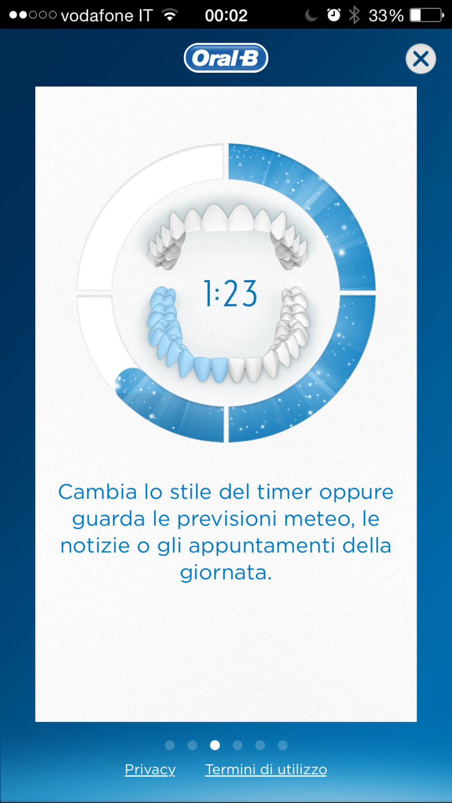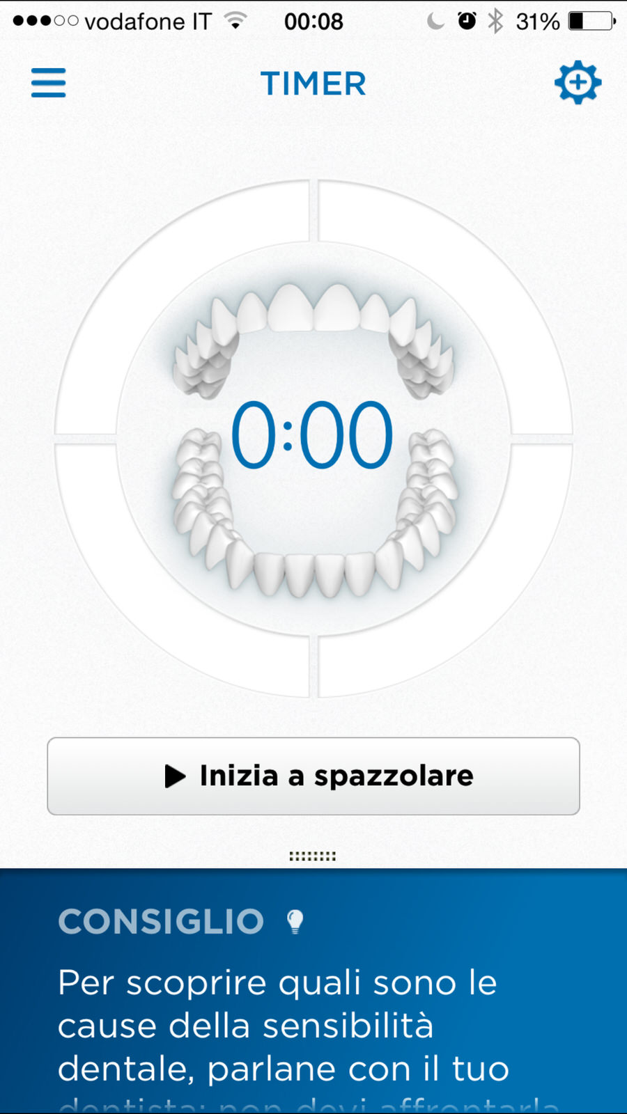 L’app, a livello molto basilare, è un semplice timer di spazzolamento: calcola la durata dell’operazione di igiene dentale avviandosi automaticamente quando si avvia lo spazzolino (da notare che iPhone, grazie all’applicazione e al microfono “ascolta” anche l’avvio del manico e opera come semplice timer se per qualche ragione Bluetooth non dovesse funzionare).