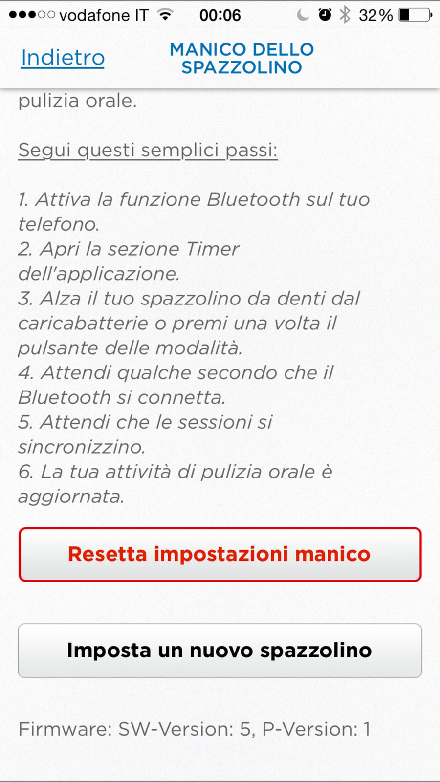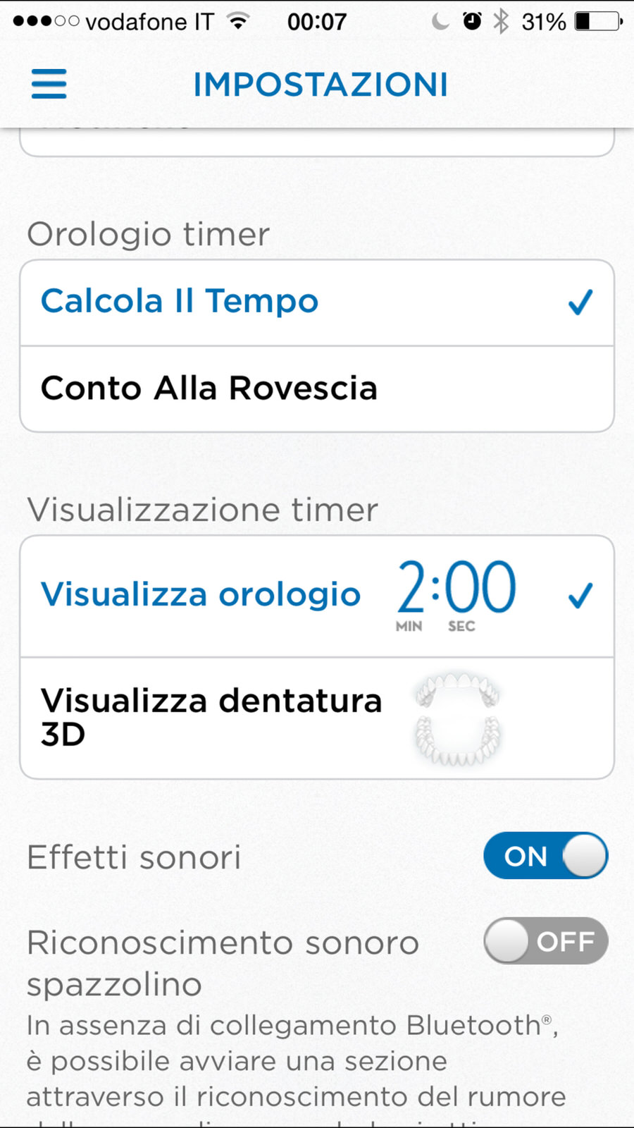 La prima operazione da fare per sfruttare la connessione è l’abbinamento via Bluetooth. L’operazione su iPhone si attua lanciando l’applicazione e successivamente mettendo in ricerca il manico (pressione per qualche secondo del tasto inferiore). A questo punto il telefono di connetterà anche se, per qualche ragione e nonostante quanto si legge nel manuale, su iPhone non vedremo l’Oral-B Pro 7000 elencato nella lista dei dispositivi Bluetooth. Questo è un problema relativo in fatto di funzionamento, ma potrebbe confondere un po’, paradossalmente, i più smaliziati degli utenti.