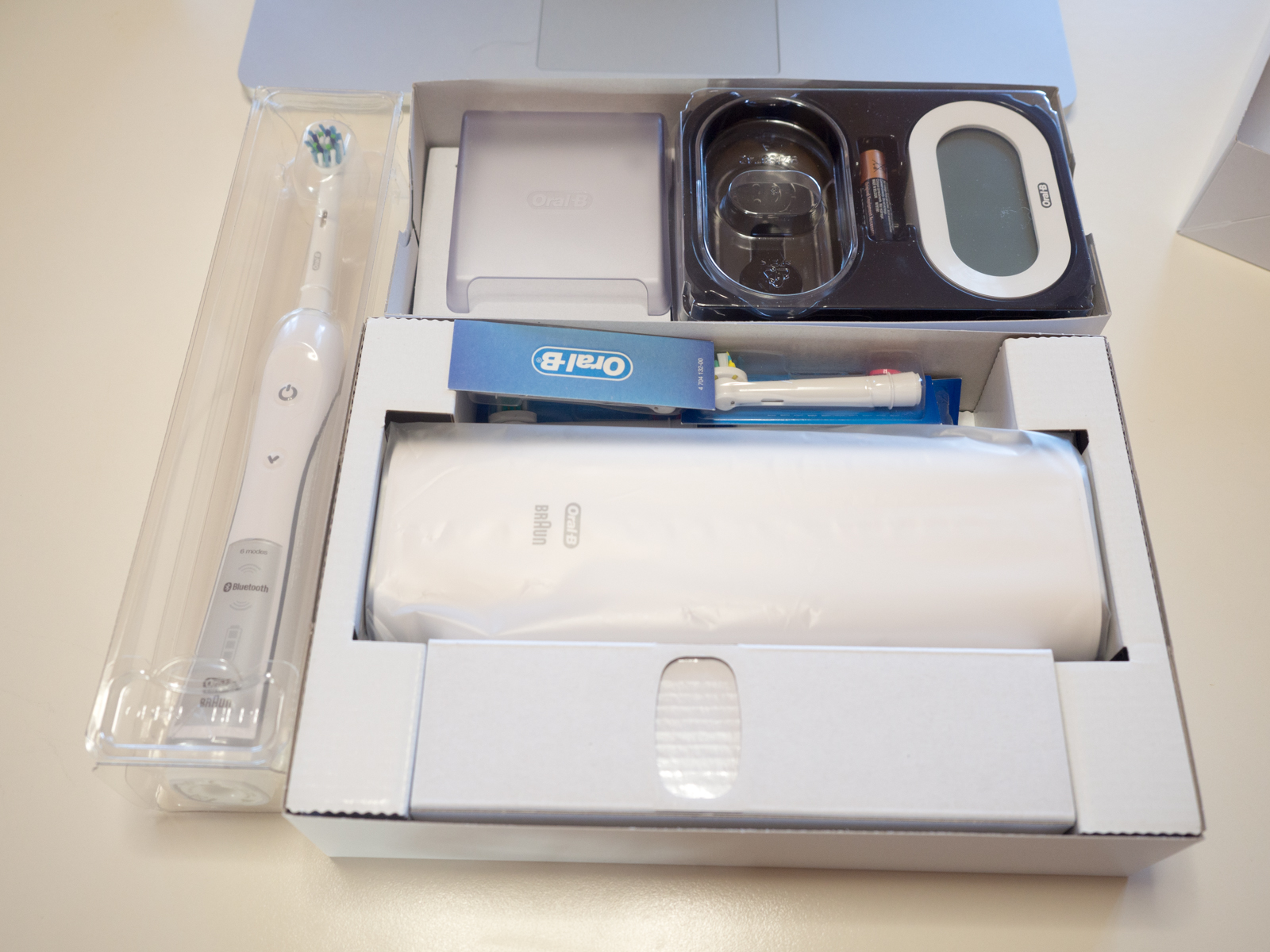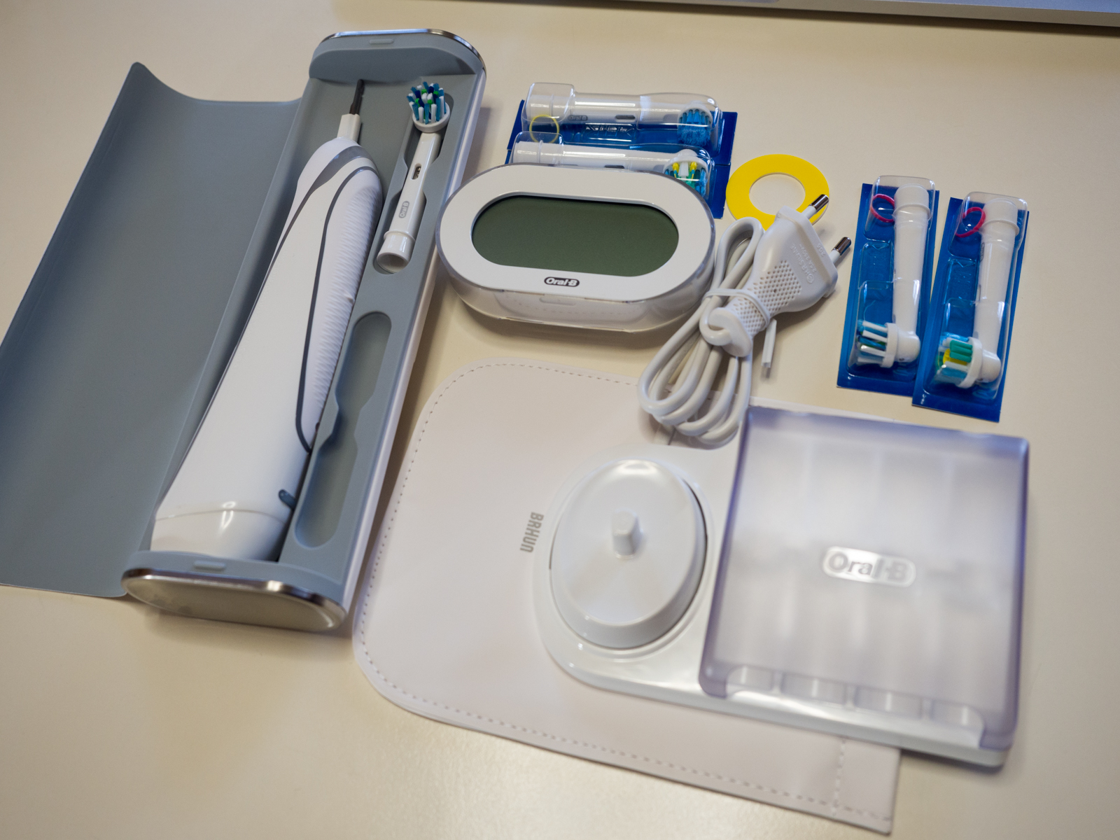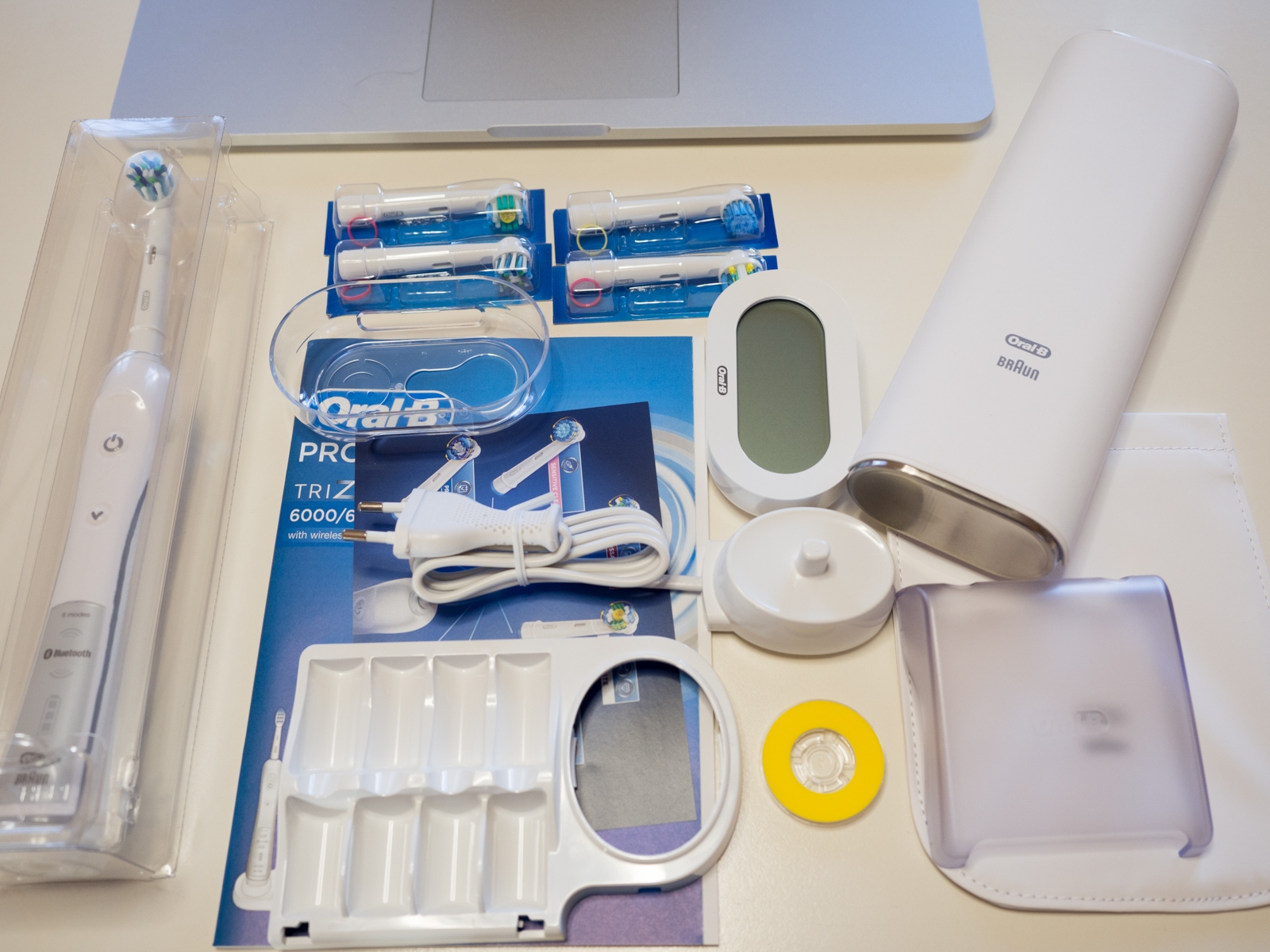 L’Oral-B Pro 7000, è il top di gamma di Oral-B e viene fornito con una dotazione assolutamente completa: nella confezione troviamo il caricabatterie (ad induzione, nessun contatto scoperto) con nicchie per spazzolini di ricambio, un display da muro che fornisce informazioni basilari in assenza di collegamento Bluetooth, cinque spazzolini di differente tipologia, una solida custodia da viaggio in alluminio, molto ben rifinita, una busta da viaggio per il caricabatterie. Tutti gli elementi che vengono a contatto con lo spazzolino lavabili, per evidenti ragioni, si possono estrarre e lavare anche in lavastoviglie.
