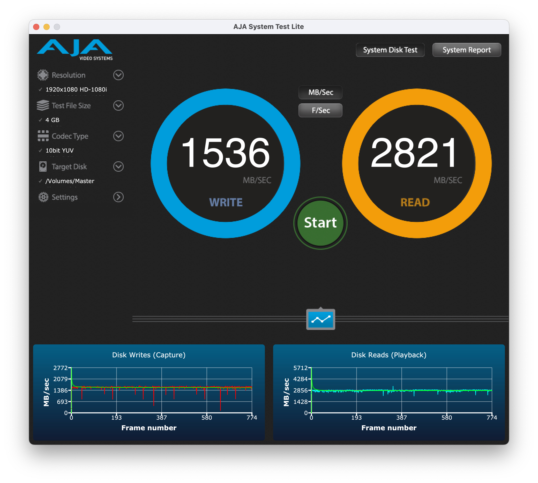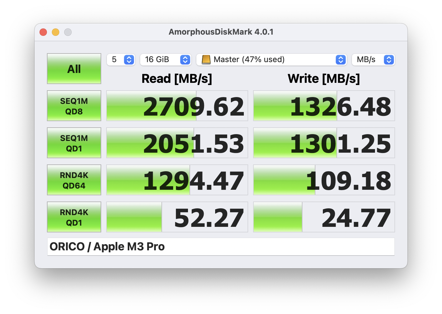 Le prove effettuate sull’unità esterna Terramaster, via USB4 su un MacBook Pro M3 Pro su connettore Thunderbolt 4, perfettamente compatibile con USB4, hanno dato esiti più che positivi.