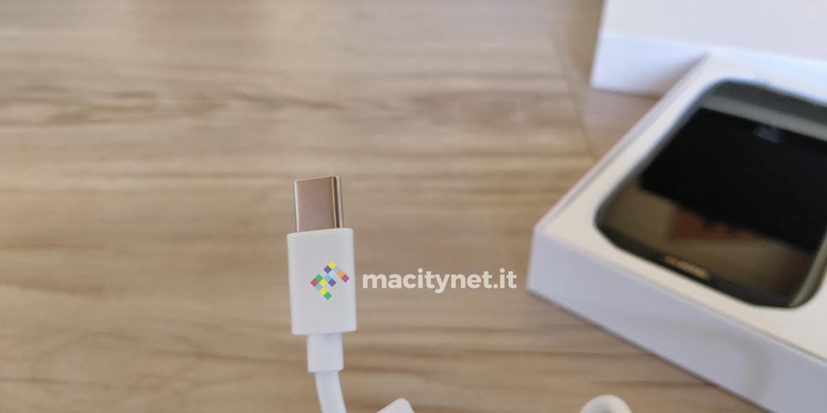 All’apertura della confezione di vendita ci si accorge subito che c’è qualcosa di diverso dal solito. Oltre al terminale, al cavetto di ricarica e alla presa da muro, e alla classica spilla per estrarre il vano SIM, c’è anche un utensile che serve per aprire in tutta facilità lo sportello che protegge l’alloggiamento delle due SIM. E’ presente anche un adattatore USB-C a jack cuffie da 3,5mm, dato che questo manca nativamente. C’è anche un secondo adattatore, USB-C a USB standard, per sfruttare la funzionalità OTG del terminale, che riesce quindi a leggere file da una comune memoria esterna.