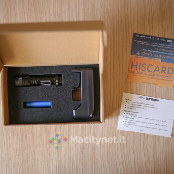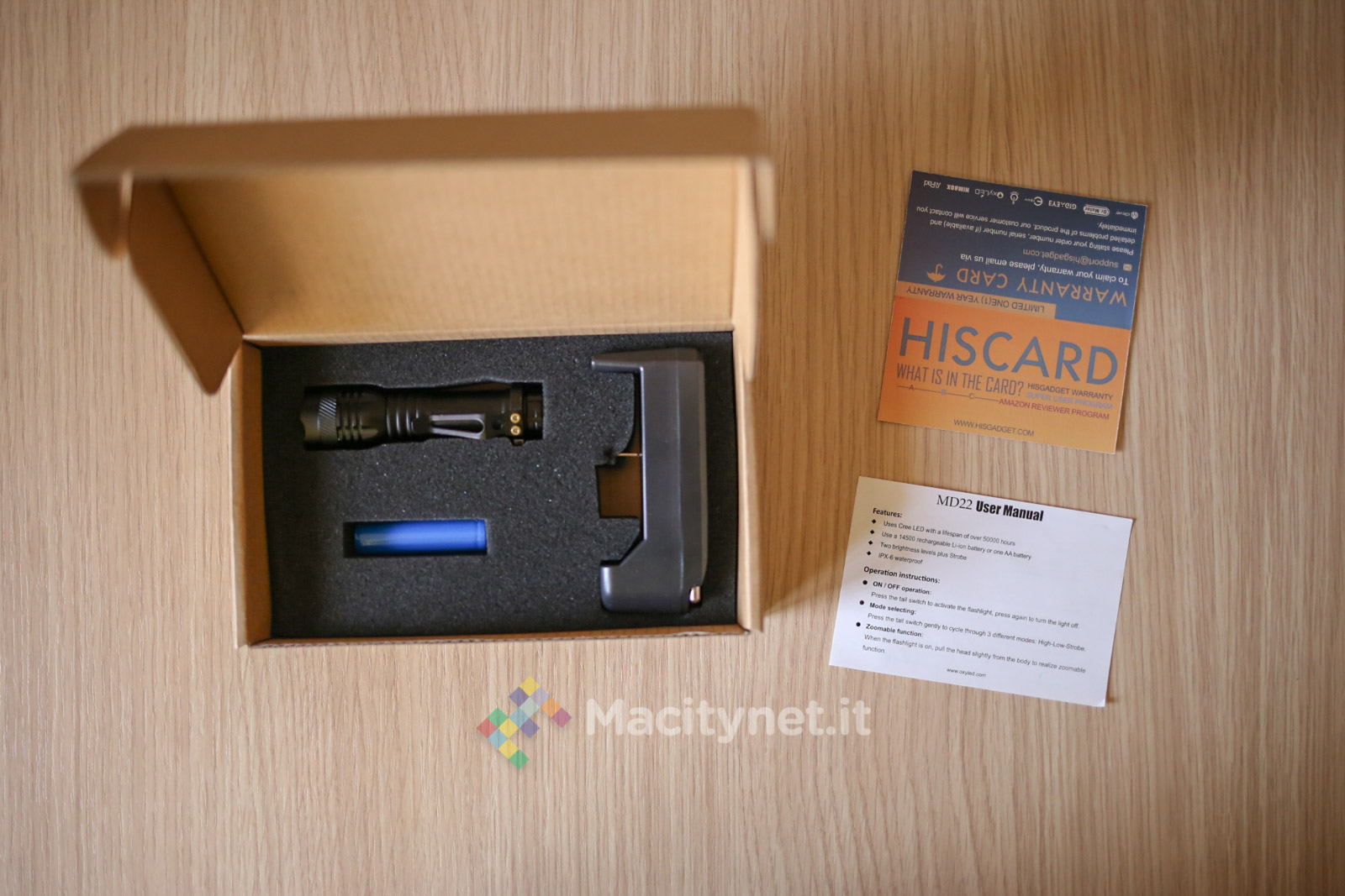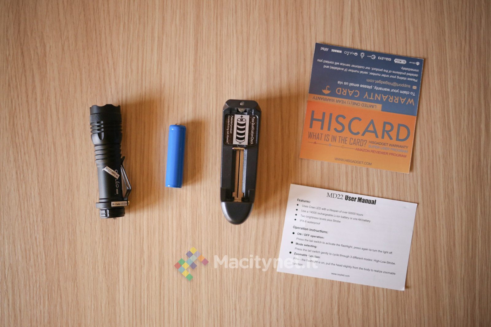 La OxyLED MD22, come accennato, è simile alla più grande MD50 fin dai materiali. Arriva all’interno di una scatola – abbastanza grande in rapporto alle dimensioni della torcia – ben alloggiata in alcuni scomparti ritagliati da uno spesso strato di gommapiuma, dove trovano posto anche una batteria ricaricabile di tipo 14500 (di poco più grande rispetto ad una comune stilo AA) da 1.200 mAh ed un caricatore per quest’ultima.