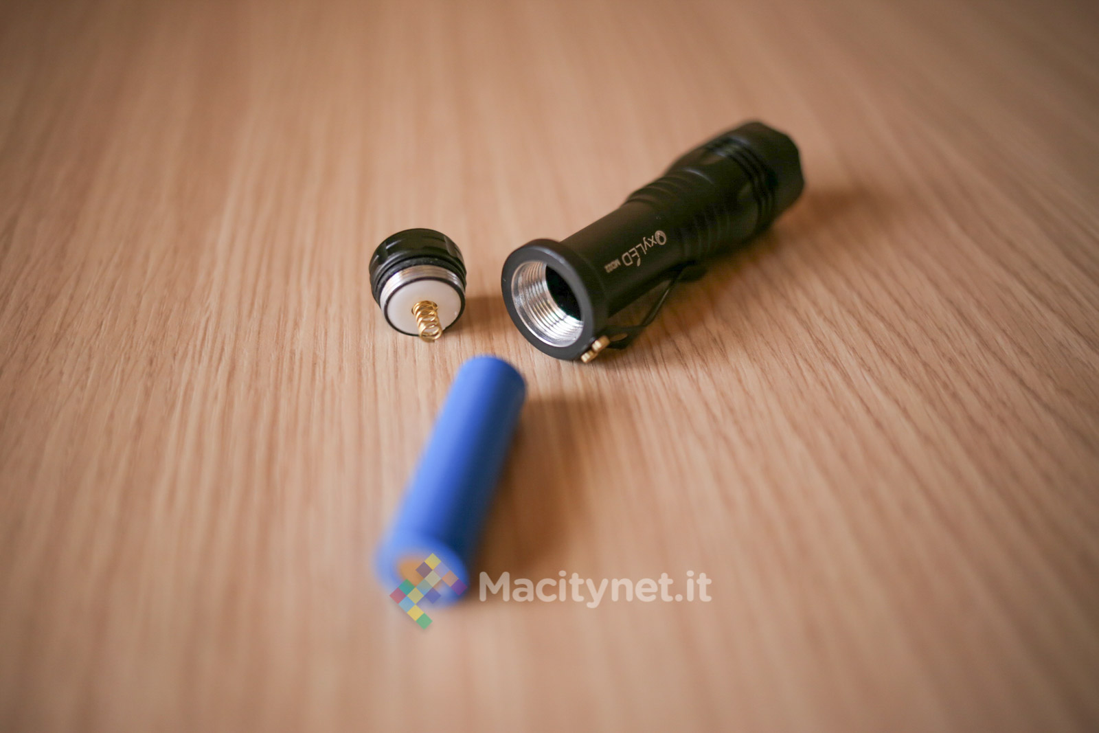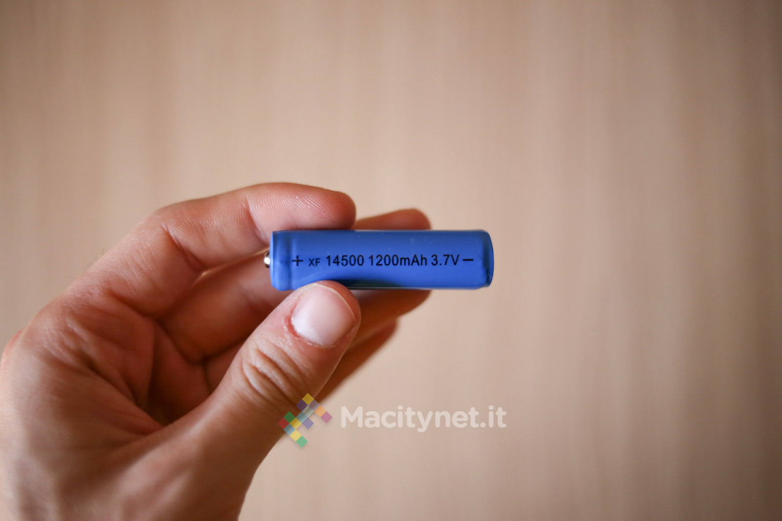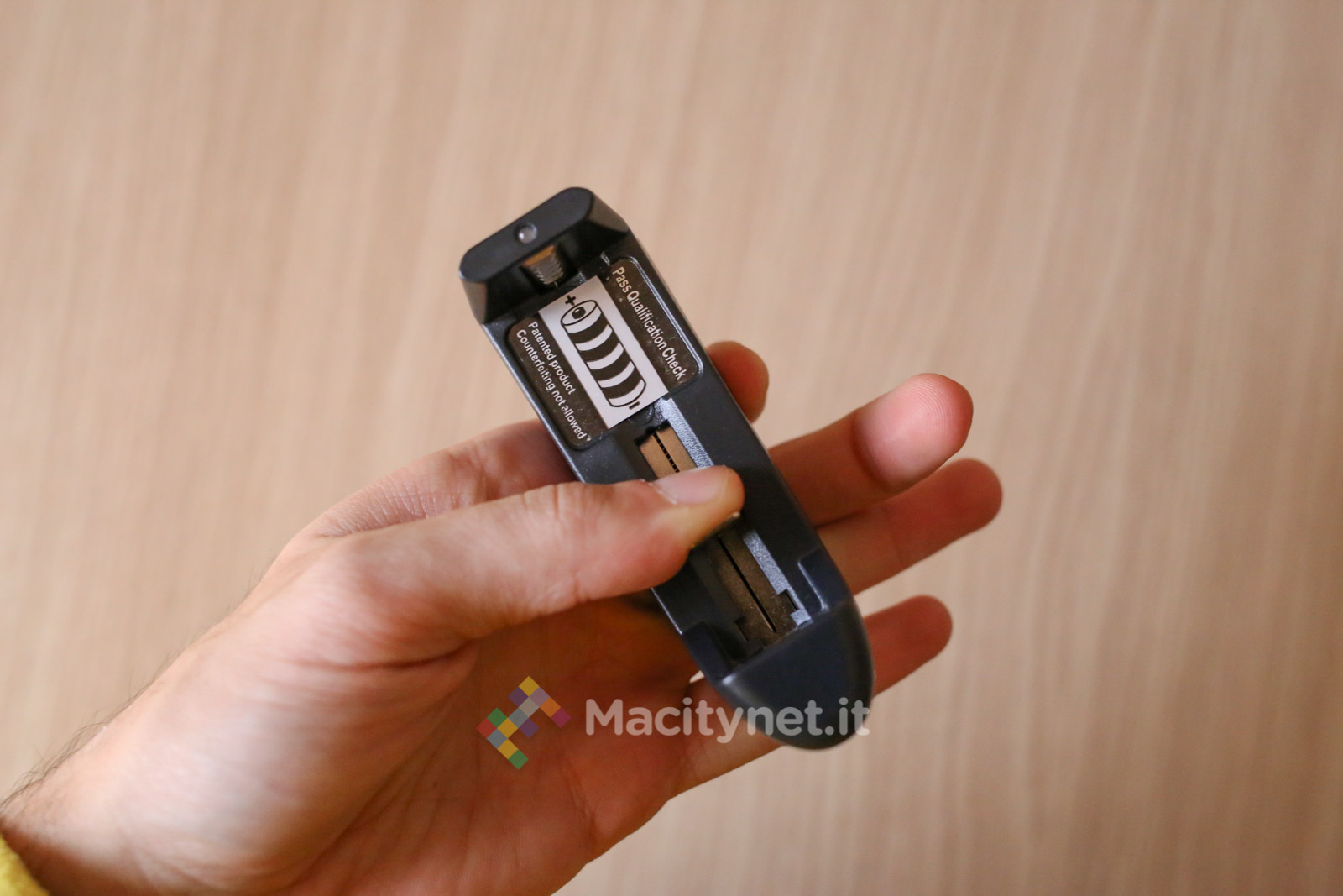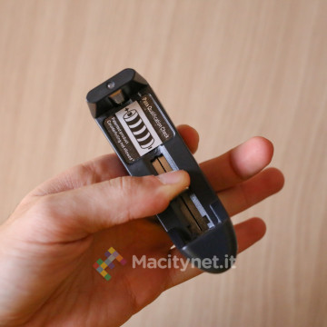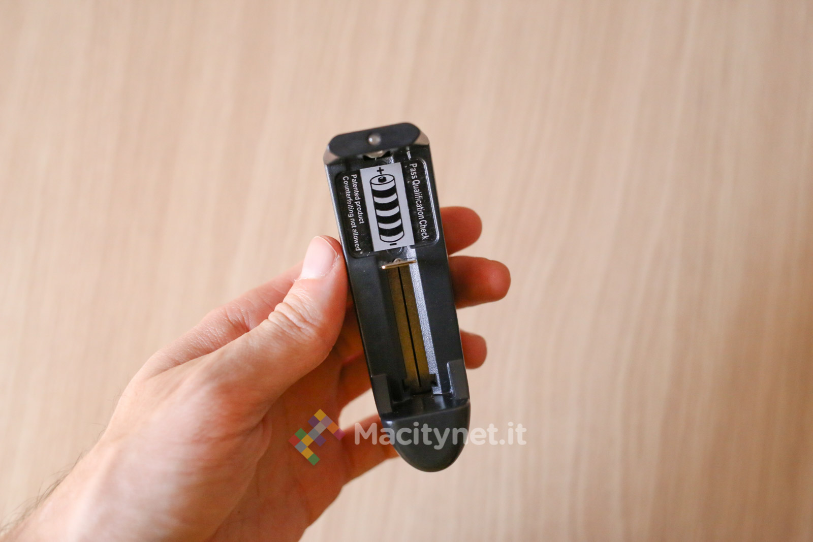 L’alimentatore ha una forma del tutto particolare. E’ molto compatto, questo perché incorpora una spina italiana a scomparsa, che si piega di 45 gradi e si nasconde nel corpo quando non è in uso. Anche l’inserimento della batteria nell’apposito alloggiamento è gestito da un sistema a molla che permette così di collegare e ricaricare qualsiasi tipologia di batteria, anche quella più grande 18650 che troviamo invece nella OxyLED MD50 già citata più volte in precedenza.