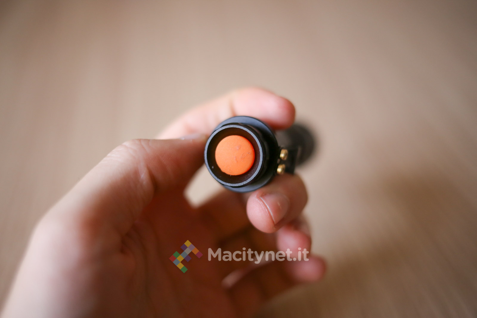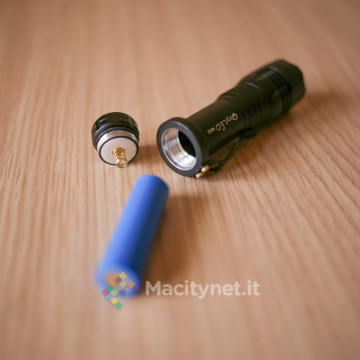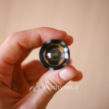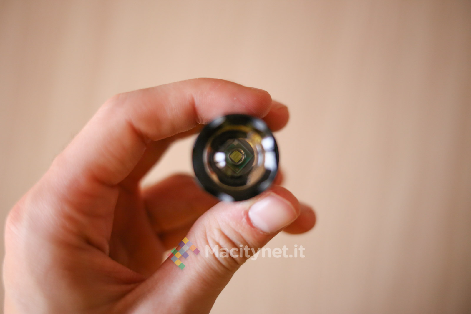La torcia, come anticipato, è realizzata in alluminio di ottima fattura. La superficie è satinata, piacevole al tatto e ben rifinita; in vetro è invece la copertura convessa del chip LED di tipo Cree, mentre la copertura dell’unico tasto ON/OFF/function è in gomma di un appariscente colore arancione.