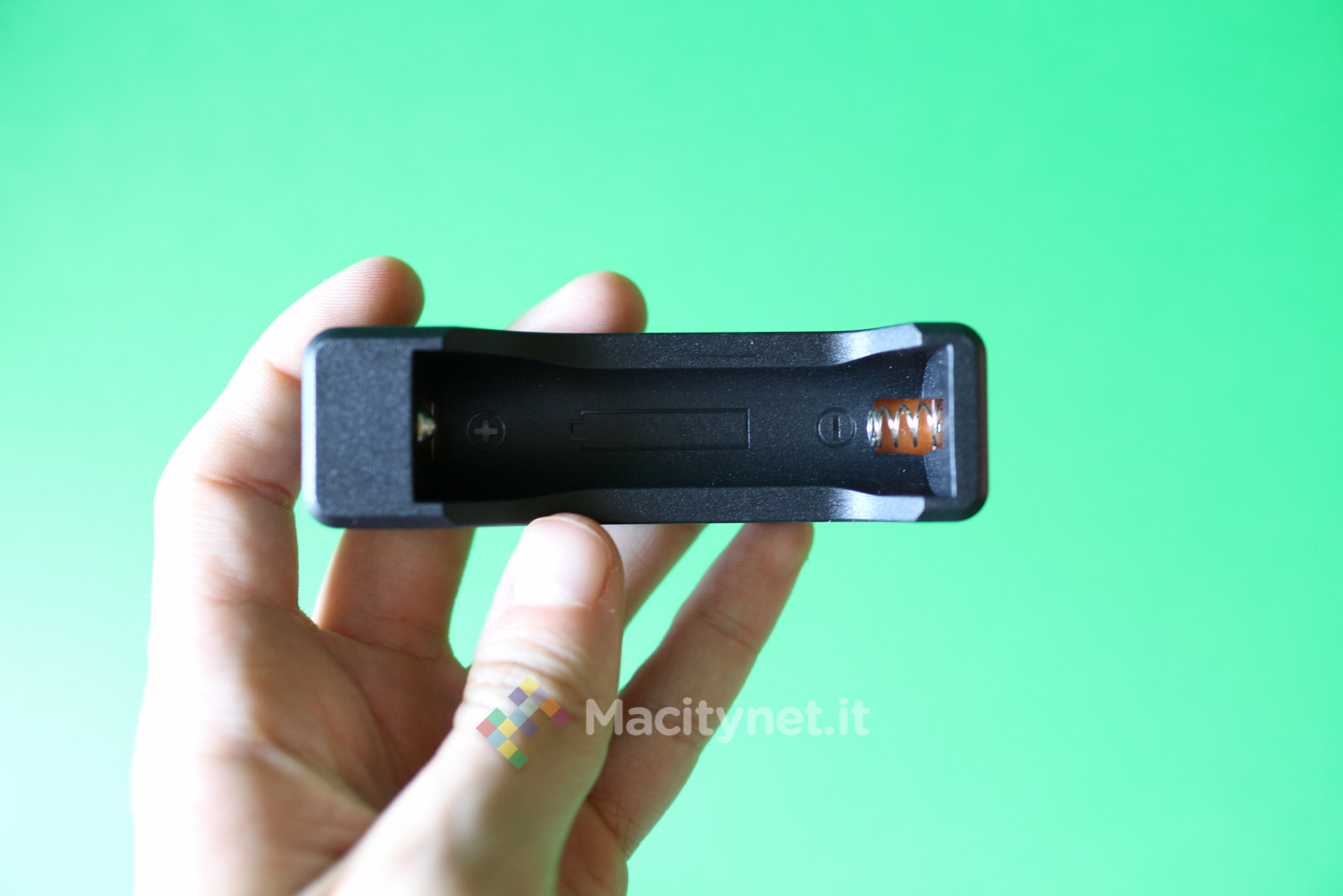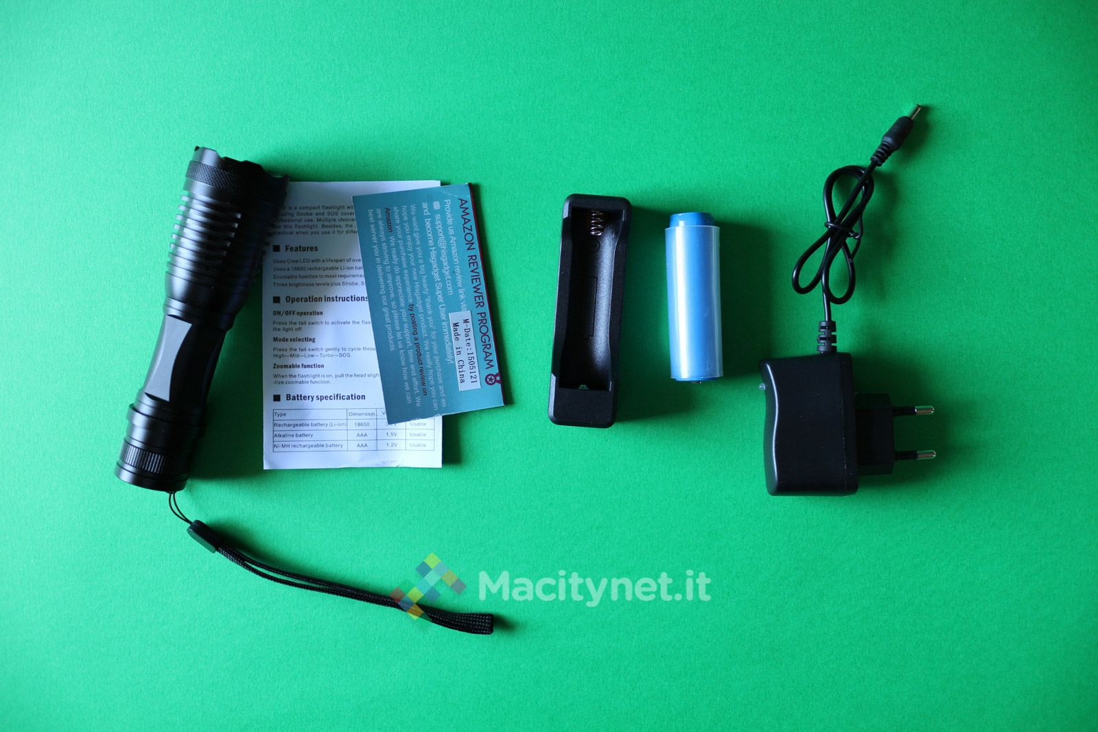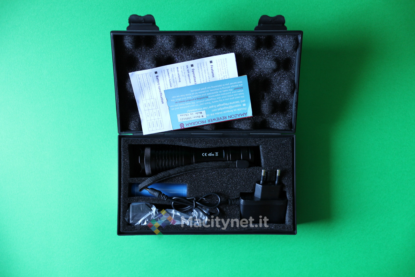 La torcia arriva a casa all’interno di una valigetta in plastica rigida imbottita con della gommapiuma contraddistinta da apposite aperture che mantengono ben protetti la torcia, un piccolo ma funzionale caricatore in plastica e una batteria 18650, dove 18650 non sono i mAh, ma è la sigla di questa categoria di batterie più grandi della classica AA. Nel caso specifico è da 1.800 mAh, ma in rete si possono trovare batterie 18650 anche più generose (qui qualche esempio) utili per raddoppiare o in qualche caso triplicare l’autonomia che, come dimostreremo più avanti, è già molto interessante anche con la sola batteria che troviamo nella scatola. Una piccola puntualizzazione va fatta riguardo il cilindro in plastica trasparente che avvolge la batteria. Inizialmente lo abbiamo rimosso, credendo fosse una qualche sorta di protezione: in realtà va utilizzato per il semplice fatto che aggiunge spessore quel tanto che basta per non far “ballare” la batteria una volta inserita nella torcia, quindi non buttatelo.