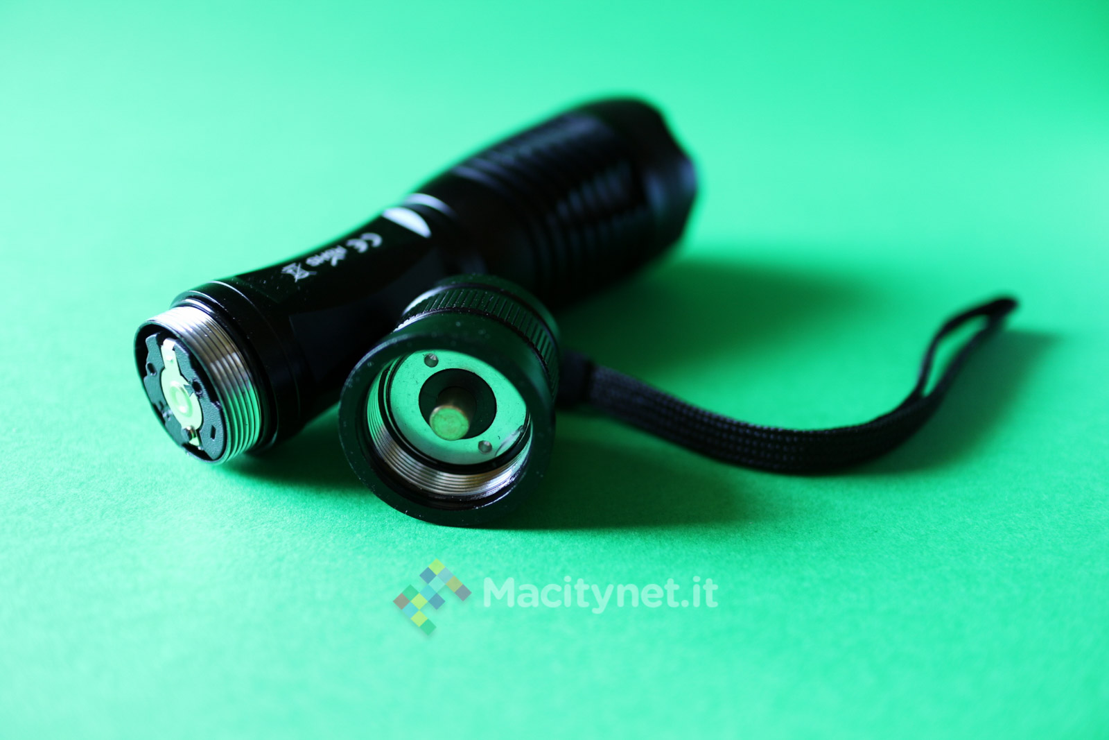 Oltre ad illuminare attraverso diverse modalità, la torcia permette anche di decidere l’ampiezza del fascio luminoso. Così come esce fuori dalla scatola, la torcia è in grado di illuminare con il fascio di luce più ampio: è però sufficiente tirare la testa in avanti sostanzialmente per allontanare il vetro protettivo (una lente di ingrandimento) dal LED che, a parità di potenza, permette di concentrare la luce in un punto più ristretto, risultando molto molto più forte.