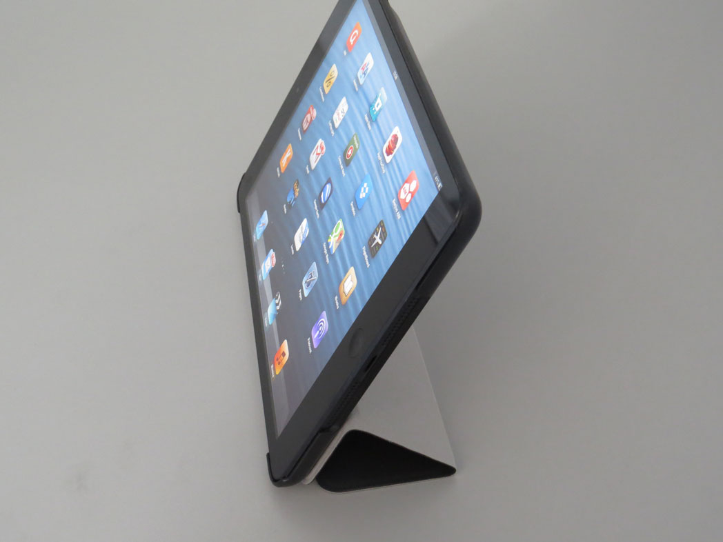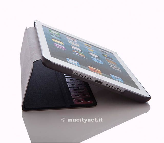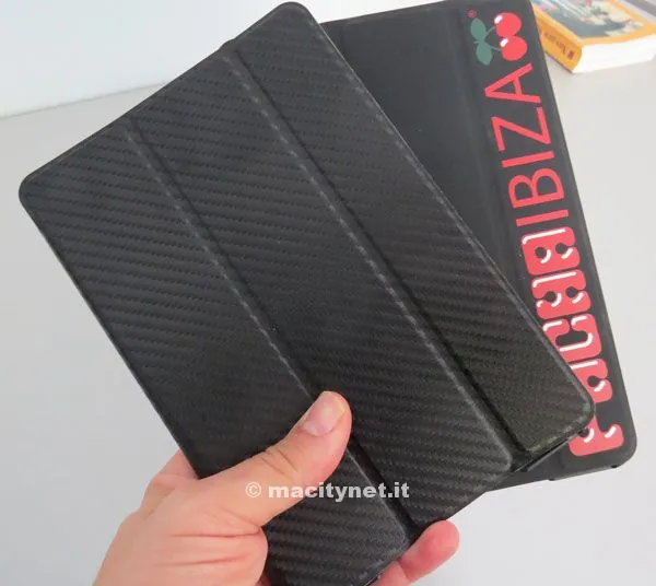La custodia che abbiamo preso in esame per iPad mini ha dorso in plastica rigida, cover in sintetico con funzione anche di leggio. Nella cover è anche annegato un piccolo magnete per spegnere e accendere l’iPad. La qualità dei materiali appare buona (anche se forse la parte superiore poteva essere resa leggermente più flessibile) e l’incastro con iPad pressoché perfetto. Buona la sensazione al tatto; la parte posteriore in plastica rigida è stata ricoperta di un materiale che simula la gomma. Internamente, per non rigare il dispositivo, c’è una sorta di pellicola in velluto.