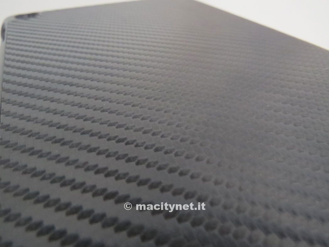 Macitynet ha poi preso in esame anche la VCubed sempre di Benjamin’s. Anche se siamo di fronte ad un prodotto molto simile dal punto di vista della costruzione alla Pacha, lo stile è totalmente differente. Si tratta di un accessorio molto “techno” che ricorda la fibra di carbonio per finitura anche se il materiale è sintetico. Sia la parete frontale che quella posteriore, hanno una trama molto fitta, nero su nero e anche se non c’è l’effetto gomma della Pacha, la sensazione al tatto è comunque piacevole.