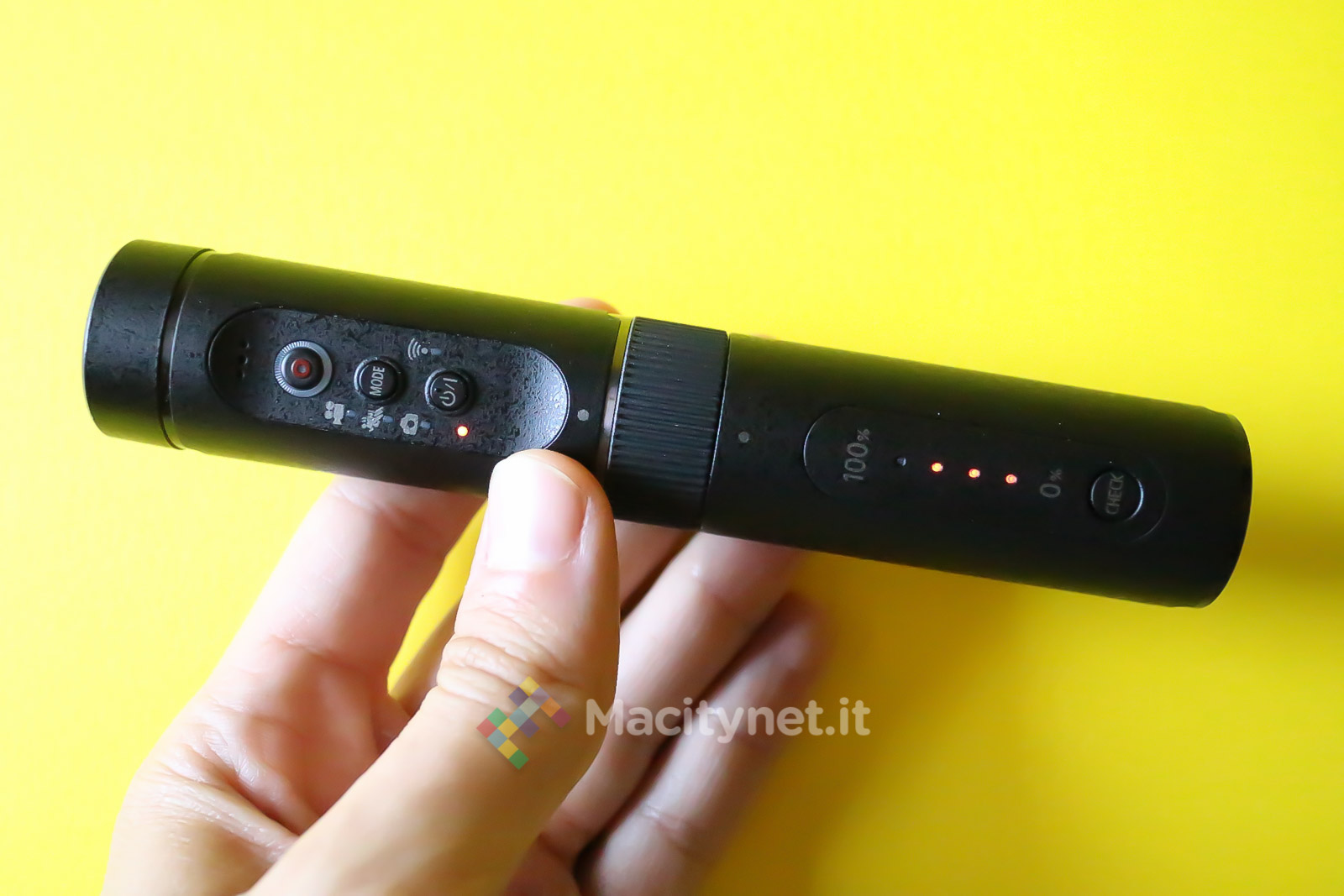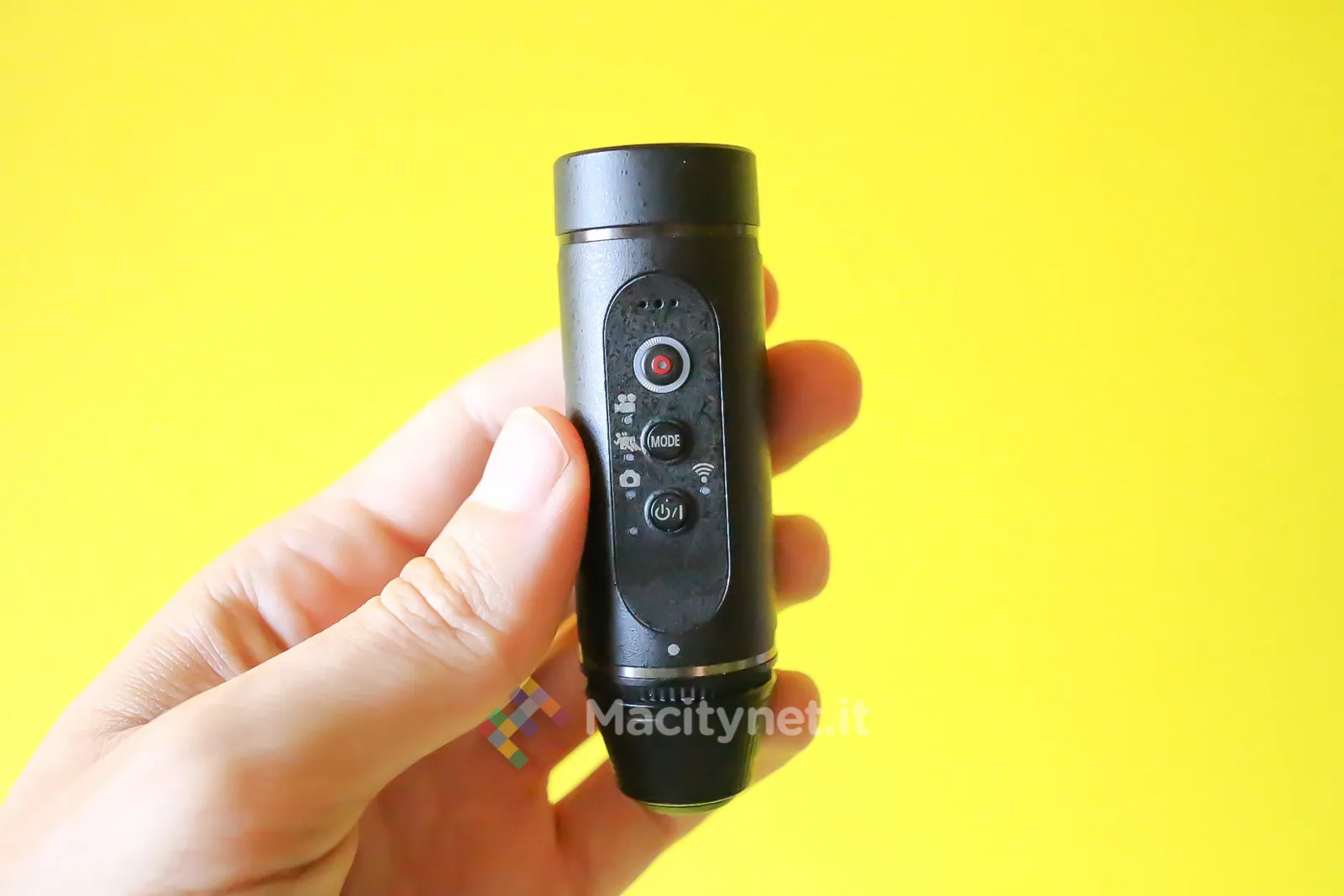 Chi come noi ha avuto modo di apprezzare la HX-A500 poc’anzi citata resta senz’altro stupito dal notevole miglioramento fatto sotto il punto di vista dell’ingombro. Nella Panasonic HX-A1M sparisce il cavo ed il telecomando da fissare al braccio, entrambi limitanti nei movimenti e nella gestione delle riprese. Piuttosto qui è tutto concentrato sul corpo della camera stessa: è nel solo cilindro, lungo appena 8 centimetri, che troviamo infatti una scanalatura dove sono posizionati i tre tasti utili per l’accensione/spegnimento, regolazione della modalità ed avvio/interruzione delle riprese.