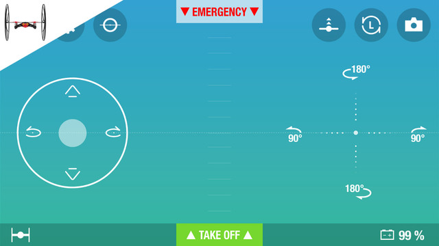Inserita la batteria nell’apposito alloggiamento si è subito pronti a volare. Il drone, in assenza di skycontroller, si pilota da iPhone, iPad, da terminali Android, Windows Phone, o anche da tablet Windows 8, come ad esempio un Surface, anche in versione RT. E’ sufficiente scaricare l’applicazione gratuita FreeFlight 3 per iniziare il volo. Un’icona verde con la scritta Take Off permetterà al drone di spiccare il volo e di rimanere fermo a pochi metri d’altezza, mentre con lo stick analogico sinistro è possibile portare il drone ad altezze più elevate e farlo ruotare su se stesso. Sulla parte destra dello schermo, invece, è possibile mantenere la pressione del dito e successivamente muovere il dispositivo per direzionare il drone. Questa tipologia di controllo può essere anche sostituita da una modalità a due joystick, o da una terza modalità per esperti, grazie alla quale è possibile anche gestire la telecamera. In ogni caso, quale che sia la tipologia scelta, l’intero schermo del dispositivo utilizzato, visualizzerà come sotto fondo il live stream di ciò che inquadra la telecamera del drone. In questo modo, sarà possibile volare anche guardando in prima persona, ciò che il drone vede in volo.