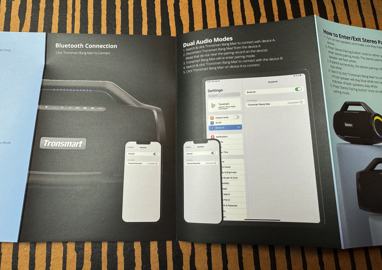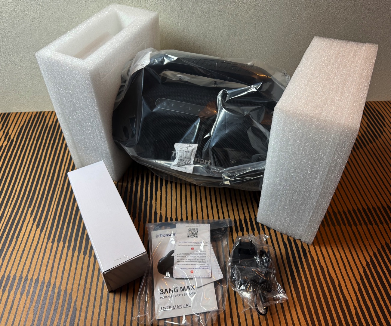 La scatola è ricca di accessori e permette di utilizzare subito Bang Max sul campo visto che arriva con la batteria già carica e, vista la durata di ben 24 ore, vi permette di provarlo e ascoltare la vostra musica preferita. All’apertura della scatola troveremo la protezione dagli urti dello speaker e tanto altro materiale in plastica: su questo dovremmo dare una tirata d’orecchi a Tronsmart che non sembra seguire l’esempio “sostenibile” di molte aziende concorrenti che utilizzano in prevalenza cartone pure riciclato per l’interno degli imballaggi.