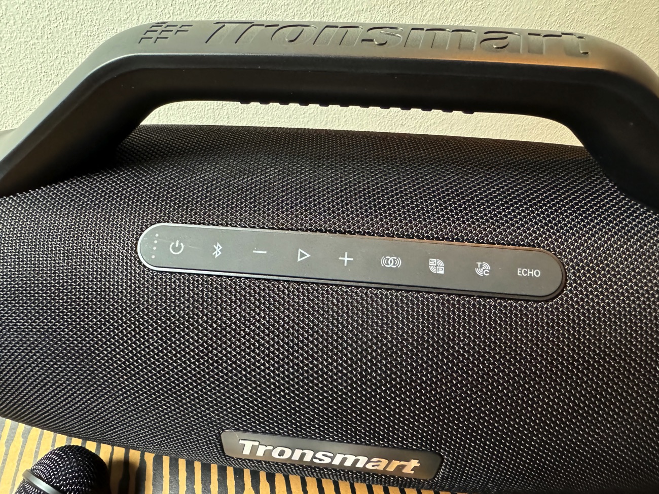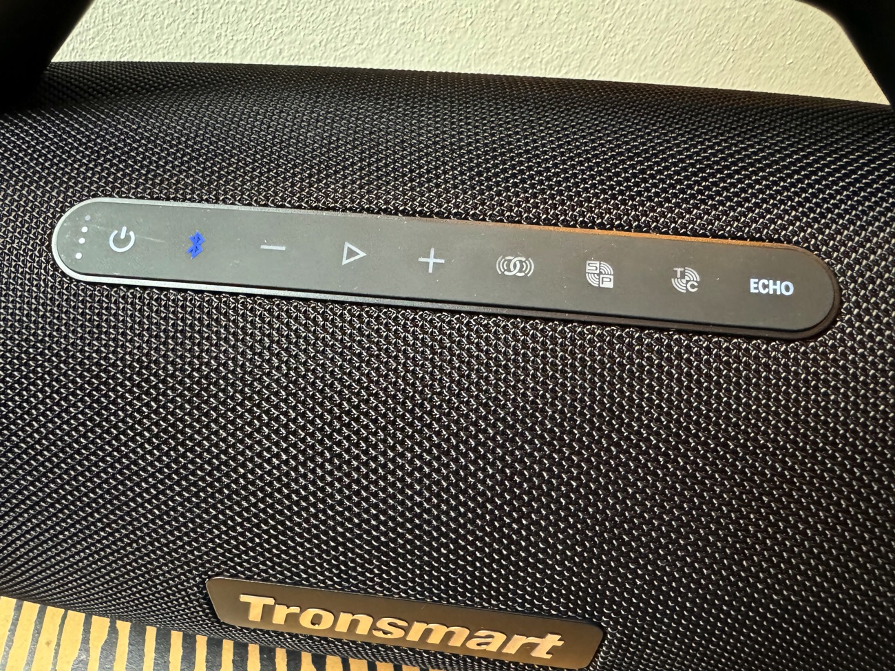 Passando alla zona dei comandi superiore abbiamo i led che mostrano la carica (un po’ generici – meglio usare lo smartphone), il pulsante ON/OFF, quello della sincronizzazione Bluetooth (qui in versione 5.3) i tasti volume/traccia e riproduzione/pausa, quello per la sincronizzazione stereo con uno o più speaker, quello per l’equalizzazione soundpulse e la sincronizzazione TueConn e infine quello che attiva o meni l’eco a tre livelli.
