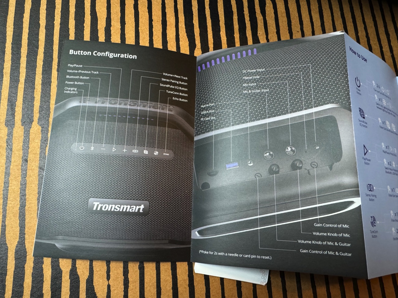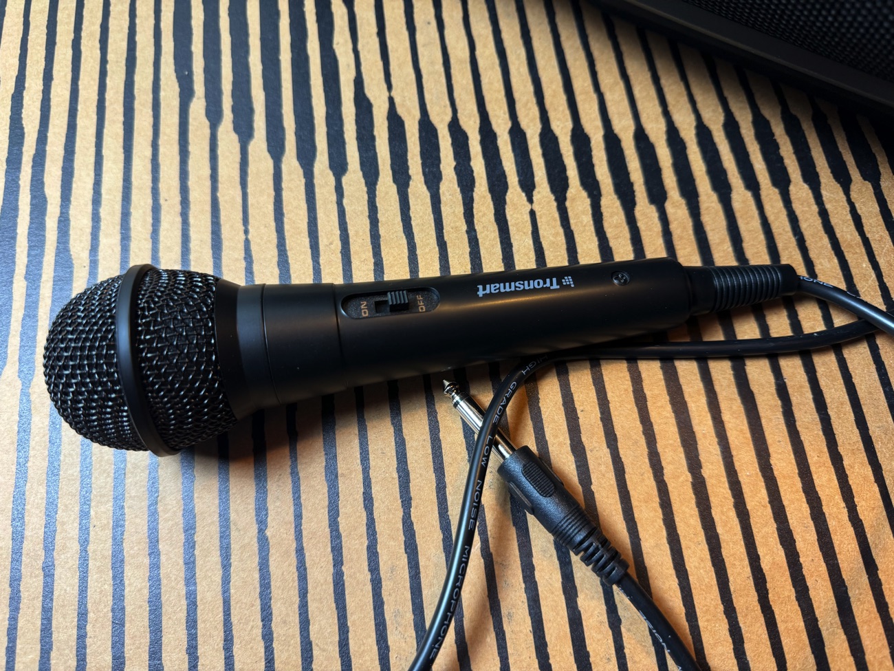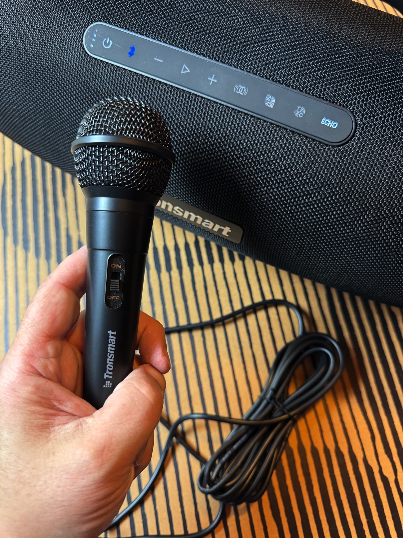 Ma torniamo al contenuto. Oltre allo speaker troviamo un piccolo alimentatore con presa proprietaria (niente USB per l’alimentazione), un cavo jack/jack e un microfono a marchio Tronsmart con interruttore che ci ricorda le funzioni Karaoke e Pa dello speaker: attenzione però che il microfono non è elencato nella confezione ed è un optional da acquistare a parte.