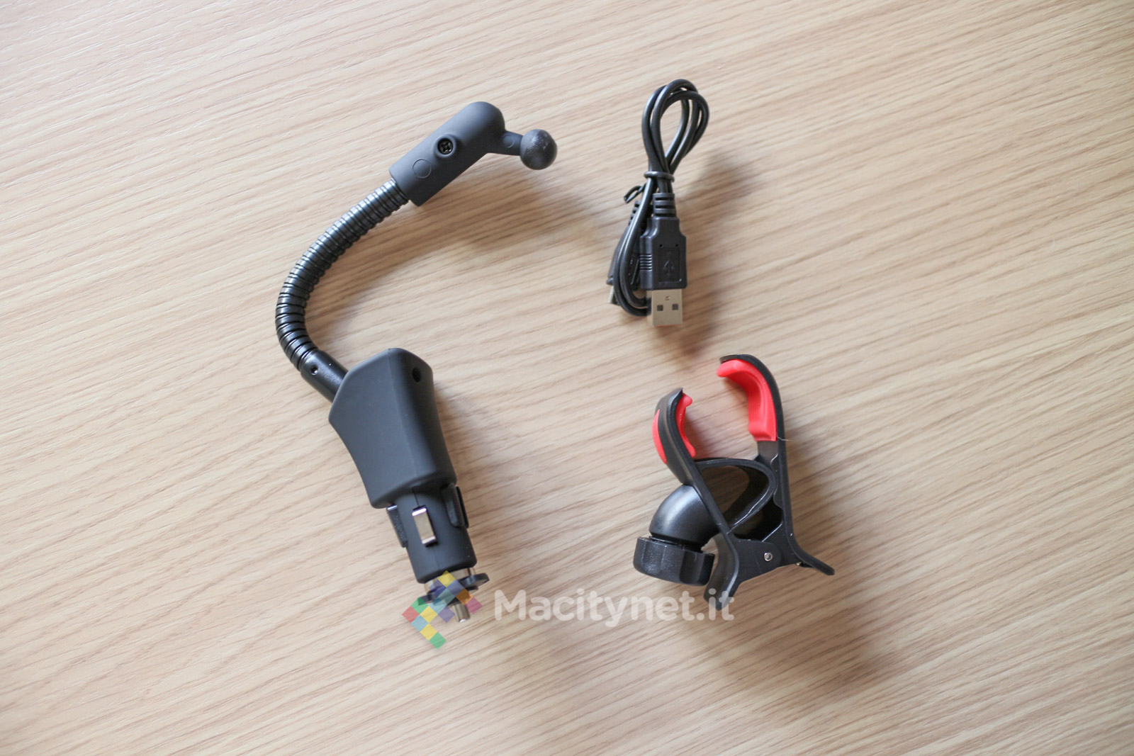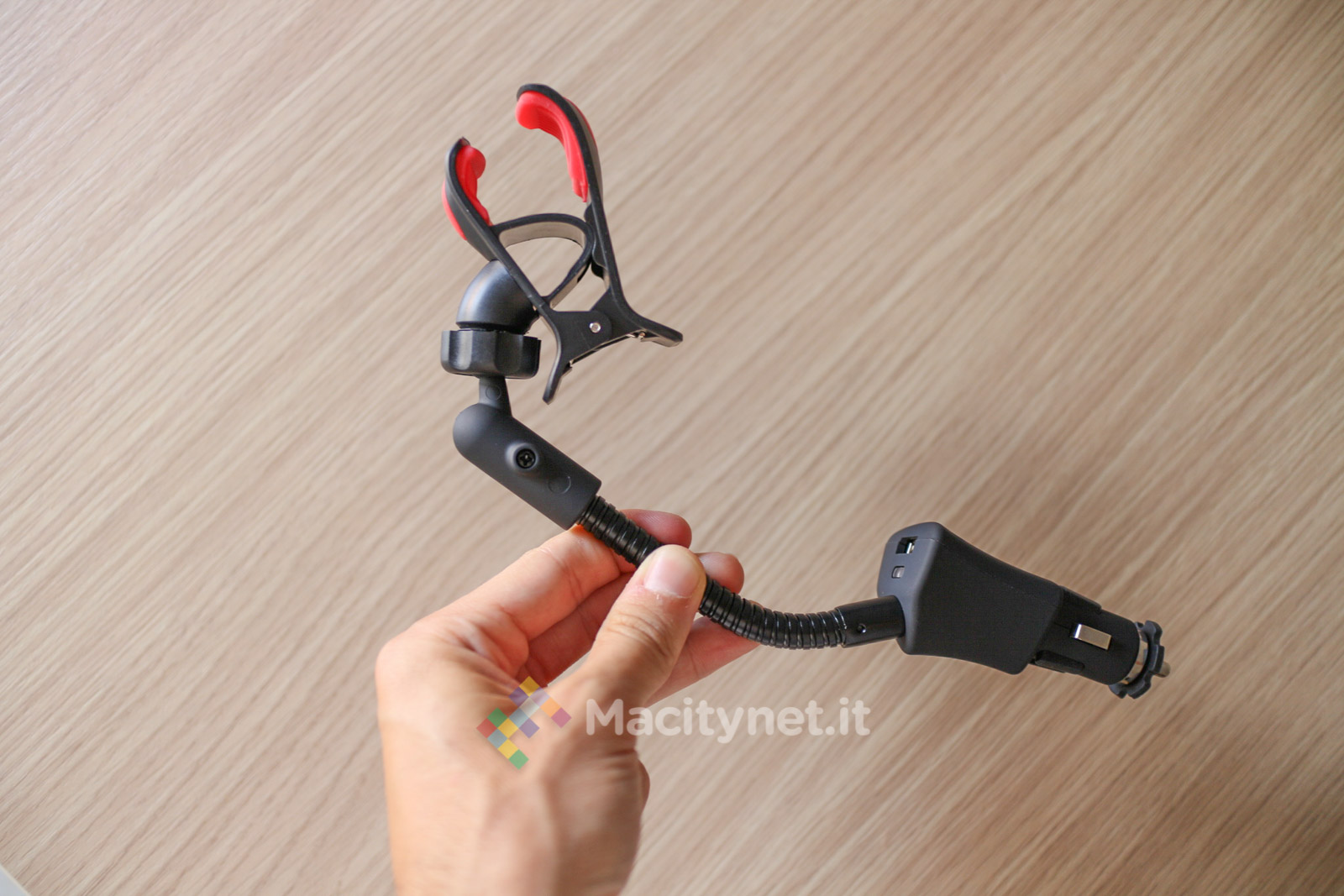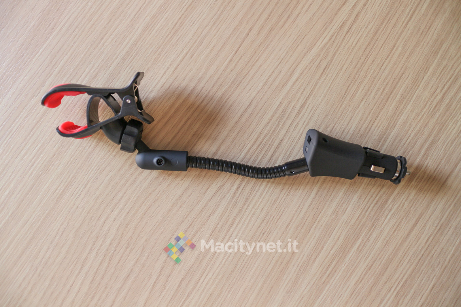 La pinza è interamente in plastica di buona qualità. Nonostante l’apertura della “molletta” possa sembrare forse troppo “leggera” per sostenere un telefono come il nostro iPhone 6 Plus che abbiamo usato per le varie prove, in realtà la presa è sufficientemente forte per tenerlo ben bloccato. Ciò è reso possibile dai due strati di gomma – removibili per essere lavati se sporchi – che afferrano il telefono ed evitano che scivoli via. In plastica è anche lo spinotto che si infila nella presa accendisigari: la copertura gommata aumenta l’aderenza all’interno della presa, in più tutta la struttura viene ulteriormente stabilizzata dalla rondella in gomma che troviamo sulla punta dello spinotto, caratterizzata da 6 piccole protuberanze che lo bloccano nella presa evitandone eventuali dondolii anche con l’auto in corsa. L’unica parte in metallo è in braccio metallico, lungo all’incirca 10 centimetri, che può essere piegato in tutte le direzioni per orientare al meglio il dispositivo agganciato. E’ molto duro e difficile da piegare, ma ciò è anche a vantaggio della stabilità generale dell’accessorio una volta trovata la posizione corretta.