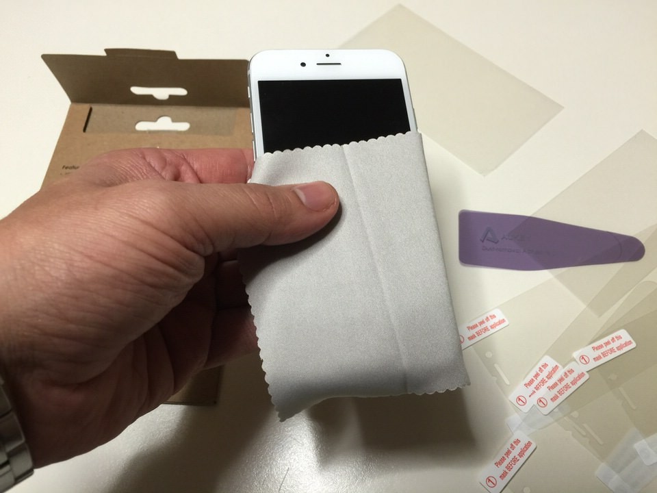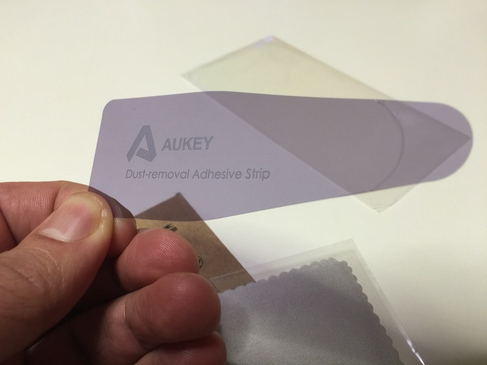 Per applicare la pellicola si deve procedere con attenzione, come sempre quando si appiccica una pellicola di plastica. In particolare si deve curare che lo schermo sia perfettamente pulito, più che dalle impronte digitali (per le quali si deve usare il panno in microfibra) da polvere e filamenti, anche se microscopici. Questi “piccoli nemici” sono il peggior incubo di chi applica una pellicola perchè una volta collocato in posizione il coprischermo, se tra di esso e il display ci sarà un granello di polvere o un filamento, diventerà immediatamente evidente. Per evitare questo problema, di solito si dovrebbe usare un artigianale nastro adesivo con il quale tamponare accuratamente lo schermo ovunque si vede un qualunque elemento estraneo (spegnete il display, sarà più facile…), ma Aukey include un comodo strumento, un adesivo sagomato che è più facile da impugnare e applicare.