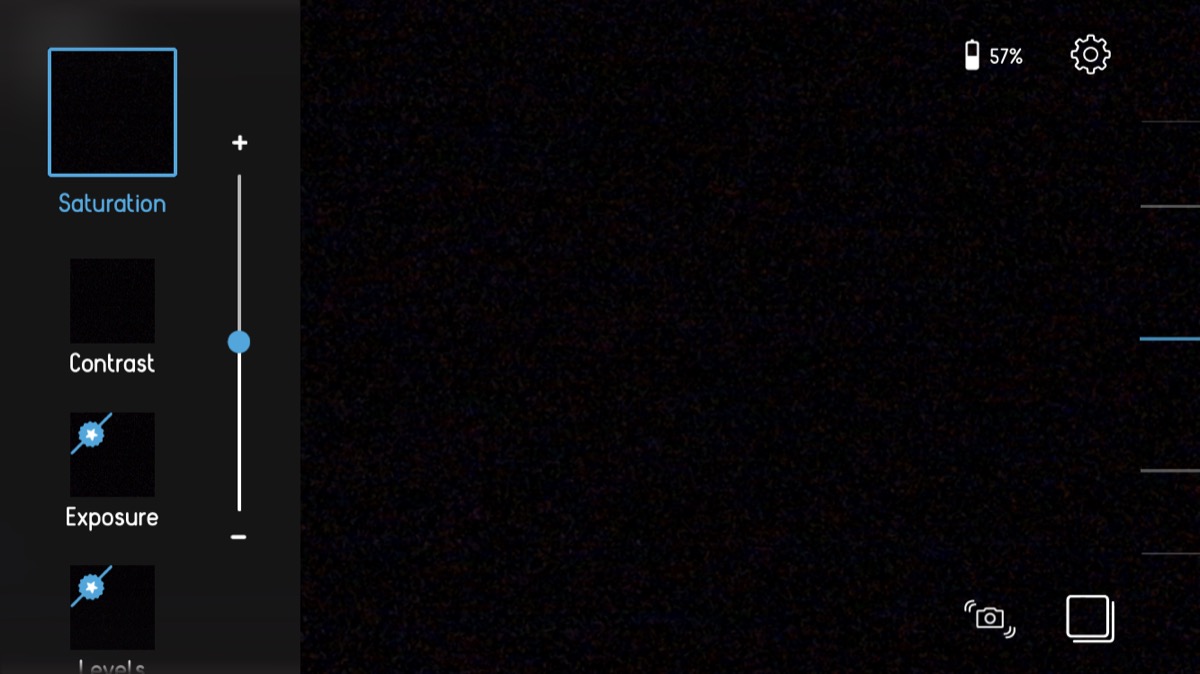 Filtri – E’ forse la scena più creativa dell’app. La ghiera normalmente dedicata all’esposizione funge da selettore delle decine di filtri disponibili, che vanno dai classici che agiscono singolarmente su specifici parametri (saturazione, contrasto, esposizione, ecc.) ai più invasivi che aggiungono vignettatura, zone sfocate, effetto a raggi-x, bianco e nero, griglia, pixel, disegno a carboncino e molti altri. Tutto viene visualizzato sullo schermo in tempo reale.