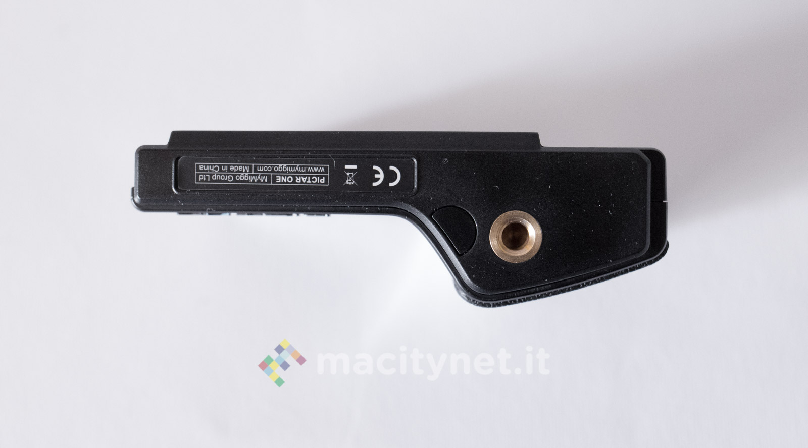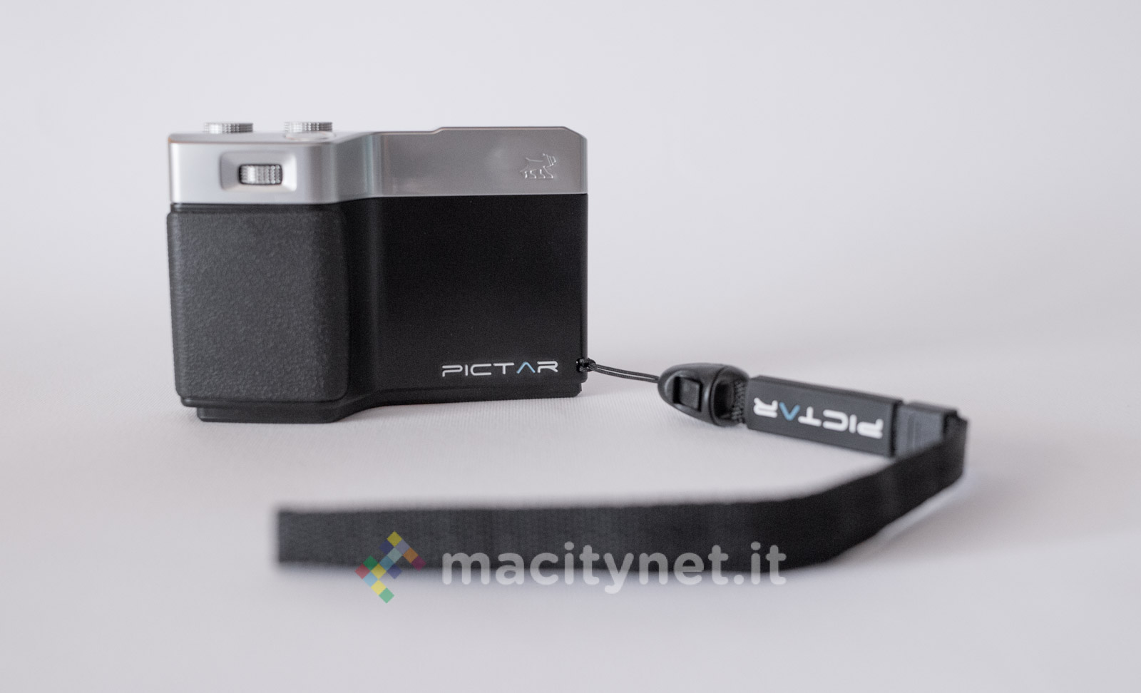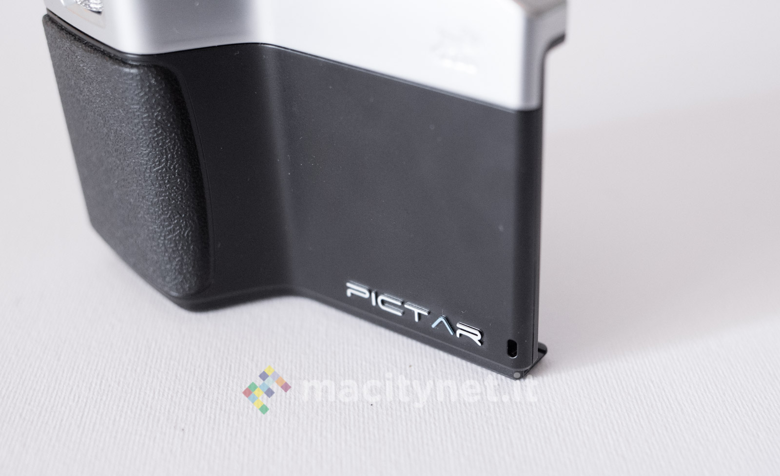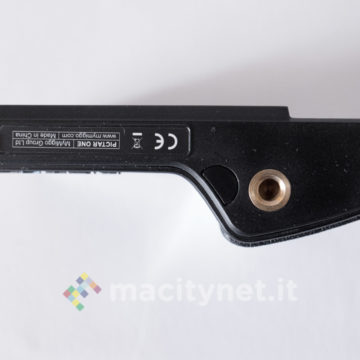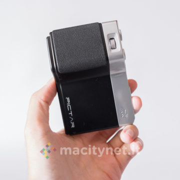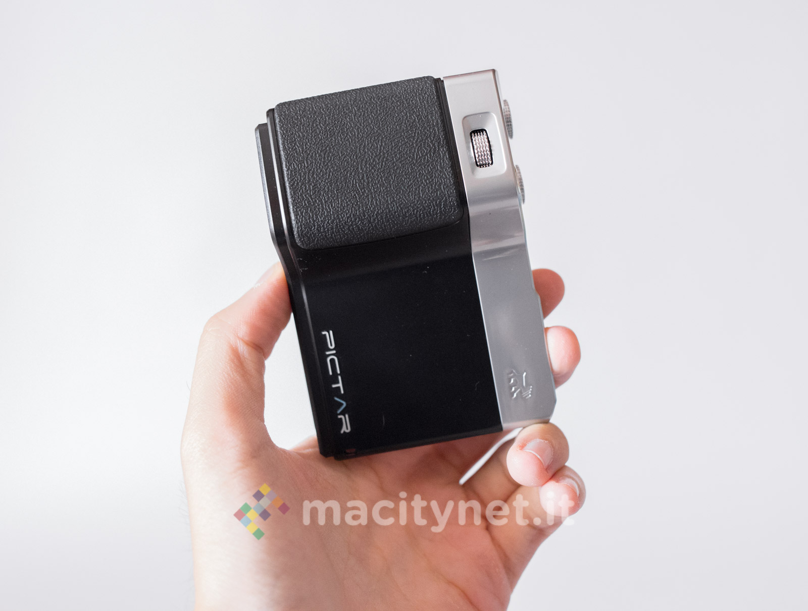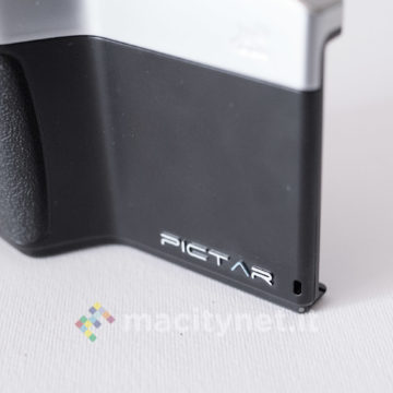 Contrariamente a quanto si potrebbe pensare sfogliando le foto, Pictar One è realizzato completamente in plastica. Questo è un bene dal punto di vista del peso (complessivamente misura 80 grammi esatti), ma l’impressione che si ha toccandolo è che un giorno, per una banale caduta, potrebbe perfino rompersi. Costruttivamente ci sembra realizzata bene, anche se forzandola ai lati la plastica scricchiola leggermente.