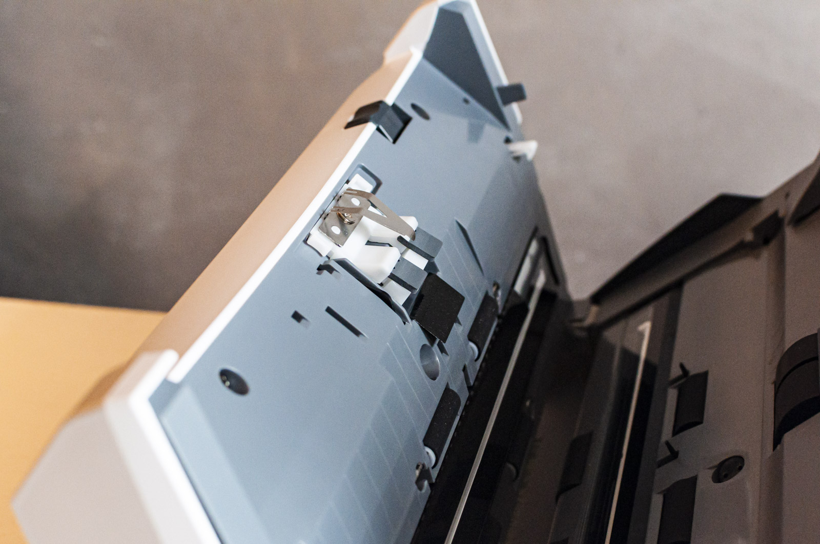 Fuori dalla scatola lo scanner va preparato agganciando le parti che servono nella parte alta alta, ad accogliere i fogli da scansione e, in quella più basso, a raccoglierli invece alla fine della scansione.