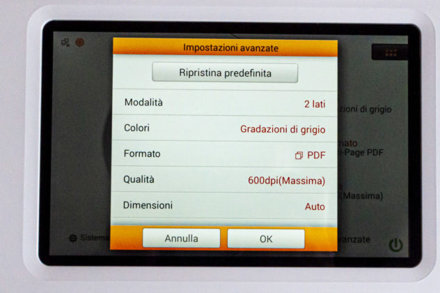 Una volta caricati i fogli, anche a blocchi, si impostano le direttive di scansione (bianco e nero/colori, fronte o fronte/retro) e la risoluzione (massima di 600 dpi).