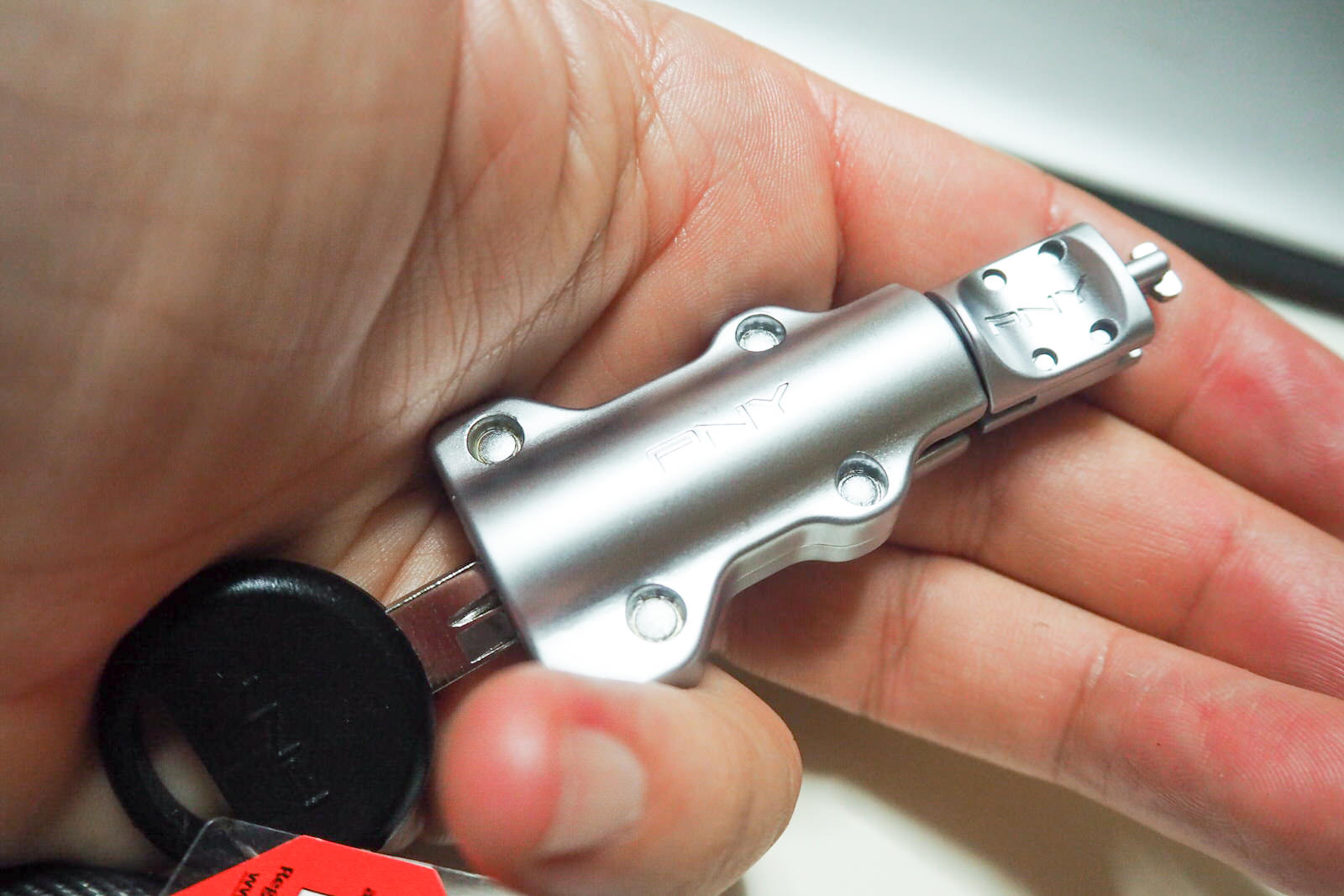 Il Thinksafe di PNY è una alternativa al classico lucchetto Kensington, un sistema di messa in sicurezza che ricorre ad un paio di soluzioni originali che ci permettono di assicurare il portatile su un piano, avendo a disposizione una gamba di un tavolo o un qualunque elemento fisso cui agganciare il menzionato cavo. Nonostante sul mercato si trovino differenti versioni, tutte sono compatibili con i MacBook Pro Retina. La differenza di cui tenere conto è solo quella sul sistema di blocco: abbiamo la versione con chiave e quella con lucchetto a combinazione. A parte questo dettaglio, il funzionamento è lo stesso e passa per una serie di piastrine ricurve che andremo a infilare nella fessura che sta tra lo schermo e il computer vero e proprio. Una volta infilata da un lato, quello della tastiera, la piastrina, sbucherà dall’altro lato, rivelando un’asola che andremo a collegare al cavo usando il lucchetto, che a sua volta potrà essere legato ad una gamba di un tavolo o qualunque cosa che potremo circondare facendo un’asola (PNY vende anche una ganascia di sicurezza da fissare ad un piano se non è disponibile un differente aggancio). Nella confezione abbiamo trovato anche un adattatore Kensington, utile per impiegare il ThinkSafe con macchine dotate di questo sistema di protezione, ma non abbiamo svolto alcuna prova utilizzando questo accessorio.
