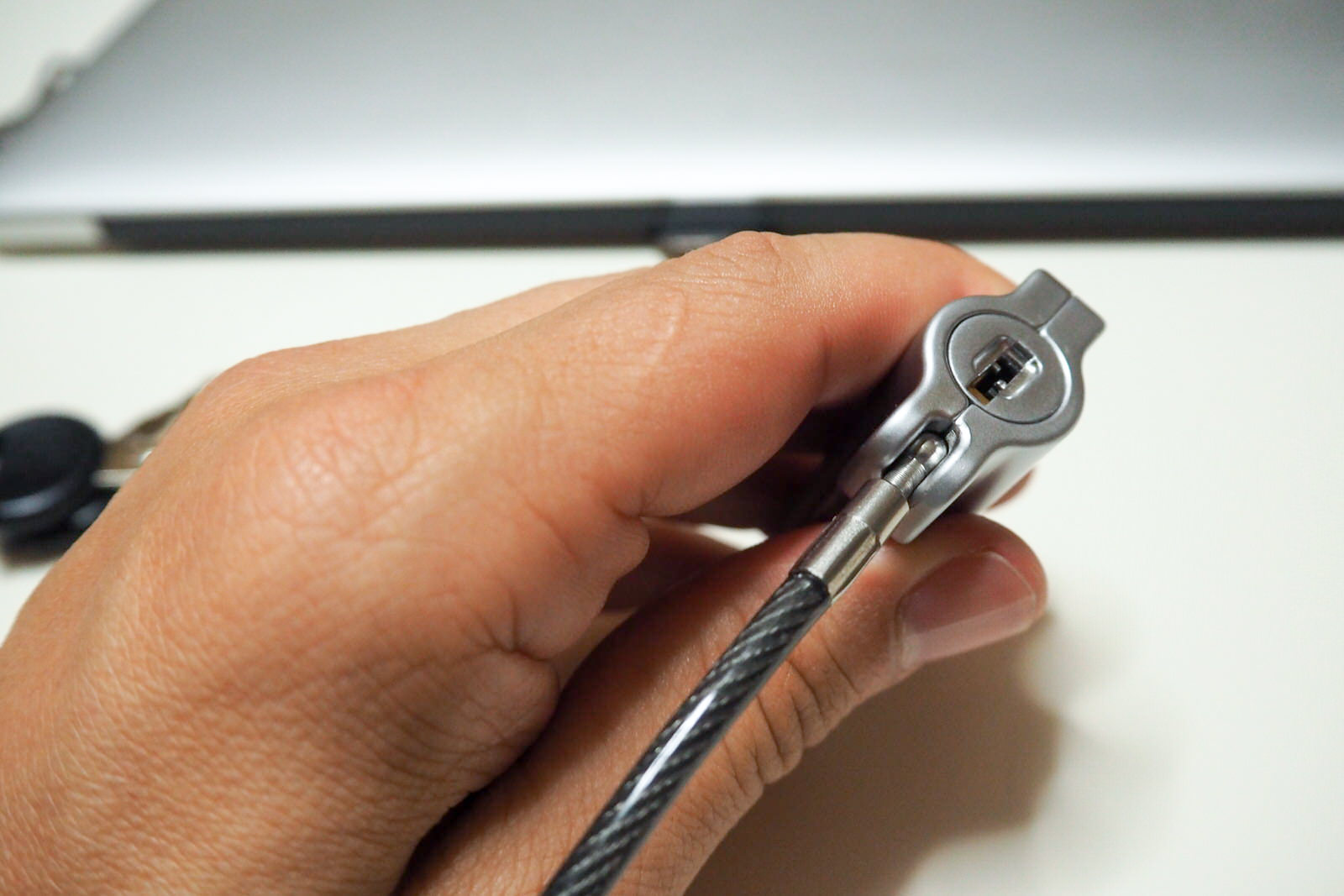 Mettere in azione il ThinkSafe è facile quanto selezionare un gancio adatto al nostro portatile. Nella scatola ce ne sono 4, differenti per lunghezza, angolo e orientamento. Ne abbiamo individuati due utilizzabili con il nostro MacBook Pro Retina fine 2013, di cui uno, più lungo, praticamente perfetto che lascia chiudere senza problemi il coperchio. Legare il Mac è altrettanto facile: si avvolge il cavo in acciaio ad un elemento che riterremo sufficientemente solido, si crea un’asola per legarlo e poi si collega il blocco in acciaio che contiene il pistoncino con uncino a molla al gancio che si infila nello spazio tra schermo e tastiera. Si gira la chiave e il gioco è fatto.