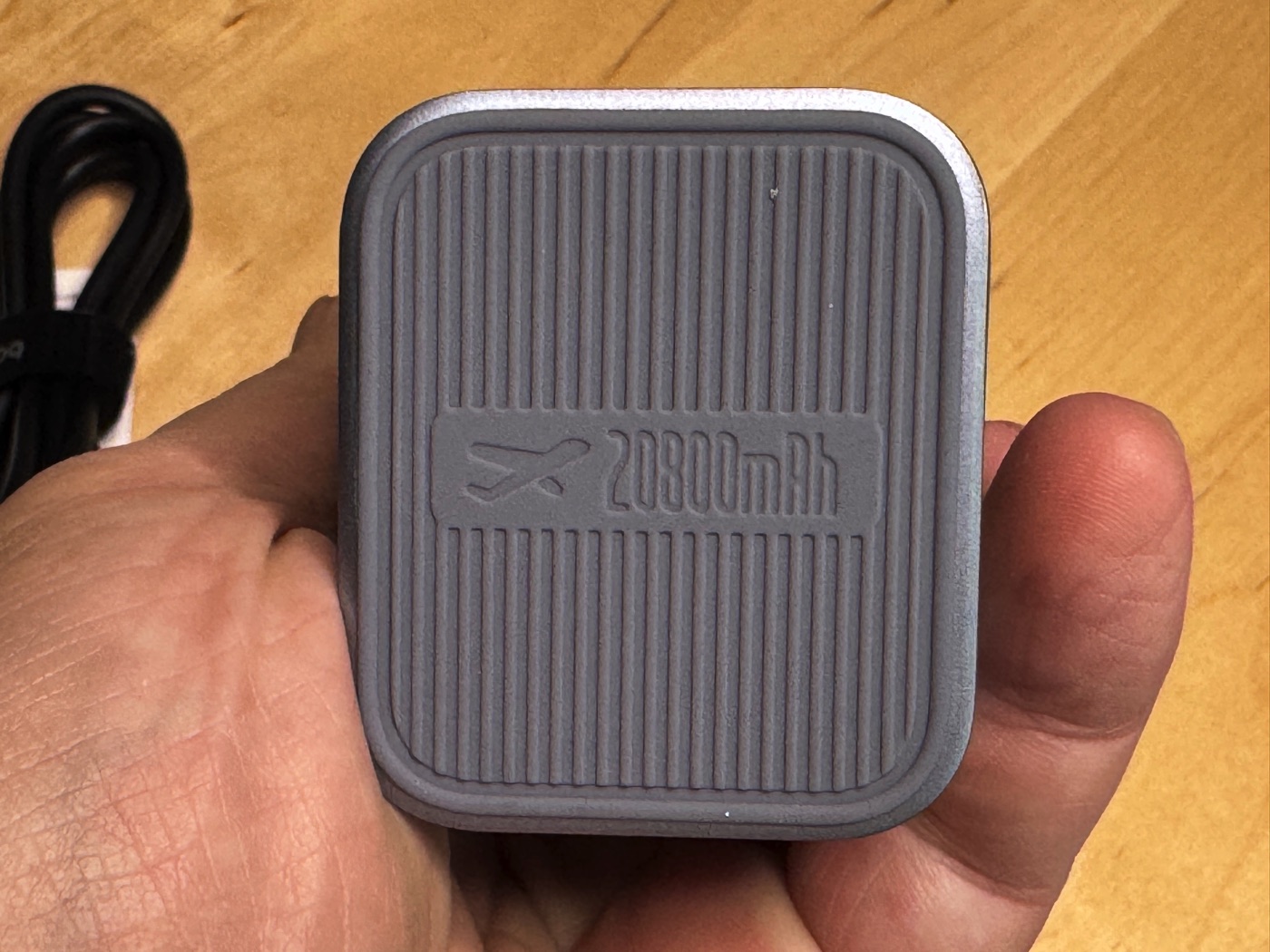 Sul fondo una superficie in gomma antiscivolo evita eventuali cadute o danneggiamenti della superficie di appoggio: il logo con l’aereo dovrebbe aiutare anche a chi fa controlli in aeroporto a permettere l’uso in cabina del power bank.