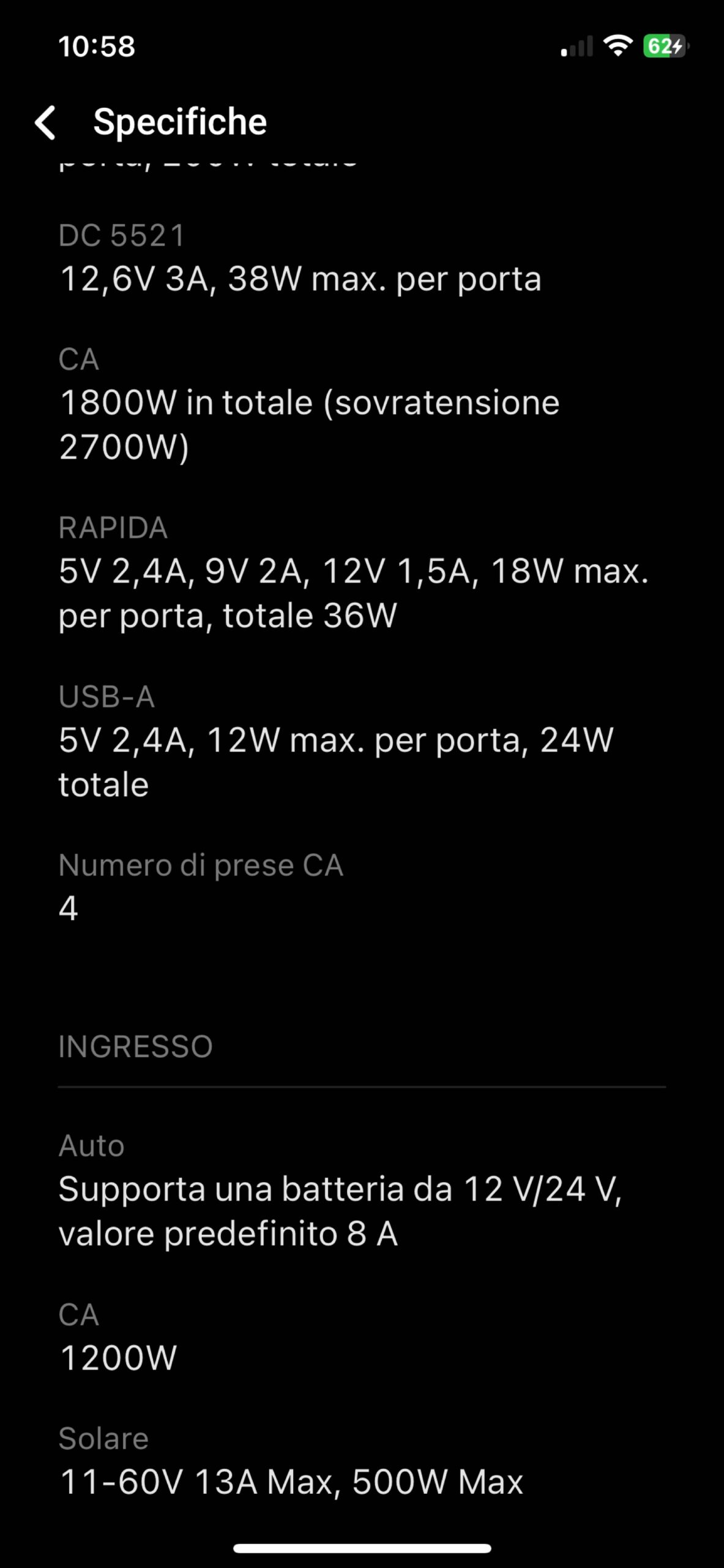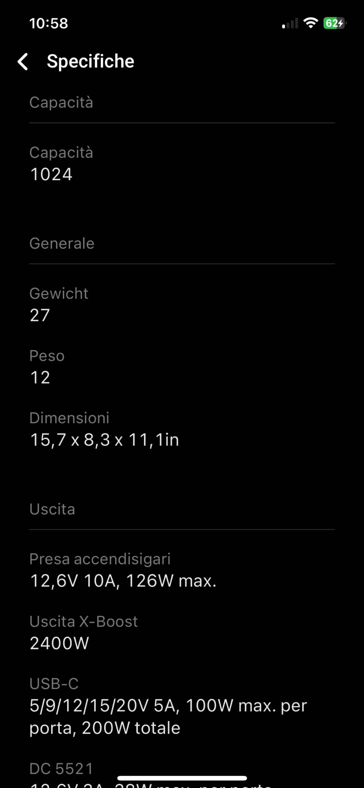 A fronte di un peso di 12 KG Delta 2 rimane ancora trasportabile grazie ai due maniglioni: se proprio non ce la fate da soli potete trasportarla in due: l’uscita AC è di 1800 W con picco di 2700, la capacità di 1024 Wh e dispone di 13 Porte di uscita di cui 4 AC.