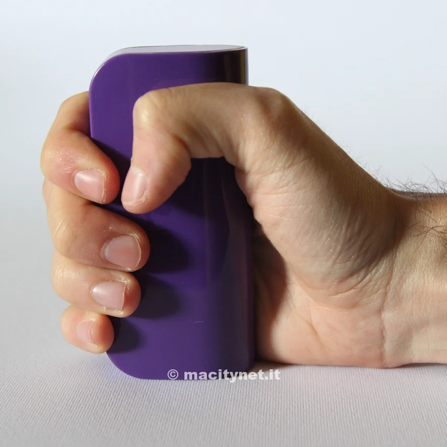 La Powerbank 5200 è in plastica lucida, abbastanza robusta al tatto e di forma tale da essere più portatile di altre batterie simili: in mano il peso si fa sentire in quanto è maggiormente spostato sulla parte opposta a quella delle prese USB, quindi nonostante i soli 137 grammi finali la sensazione in tasca è ben diversa. Esteticamente è molto semplice: di forma curva in un lato e piatta nell’altro, su una delle due basi troviamo le due porte USB, co uscita in A segnata per ciascuna di esse, in modo da individuarla facilmente in caso di bisogno: 2.1 A in una, 1 A nell’altra. Oltre alle due porte USB, troviamo l’ingresso microUSB per la ricarica del dispositivo stesso; sul lato piatto sono localizzati 5 LED ed il pulsante di accensione.