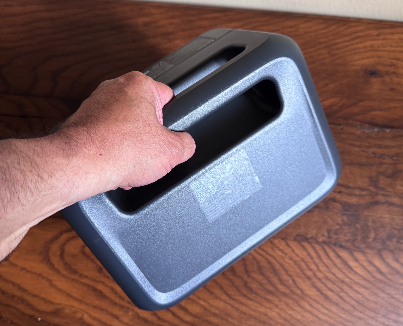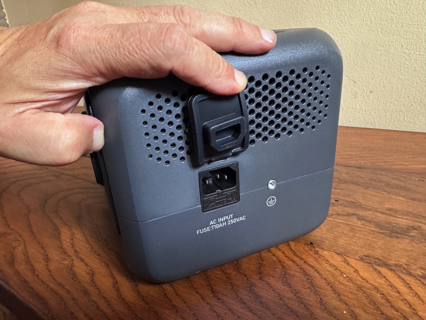 Sul lato destro troviamo l’ingresso AC e la vite di massa oltre alla foratura che serve ad areare l’interno mentre la ventola con i suoi fori è sul lato opposto. Manca la ricarica wireless e non c’è la torcia integrata: niente di che ma chi viene dalla EB3A (di cui questa Elite 30 V2 è l’erede) noterà l’assenza. In cambio si guadagnano ingombri e rumorosità: sotto carichi leggeri la ventola si sente appena, restando sotto i 30 dB e quindi tollerabile anche in una camera da letto durante un blackout notturno o in un ufficio dove è richiesta una buona concentrazione.