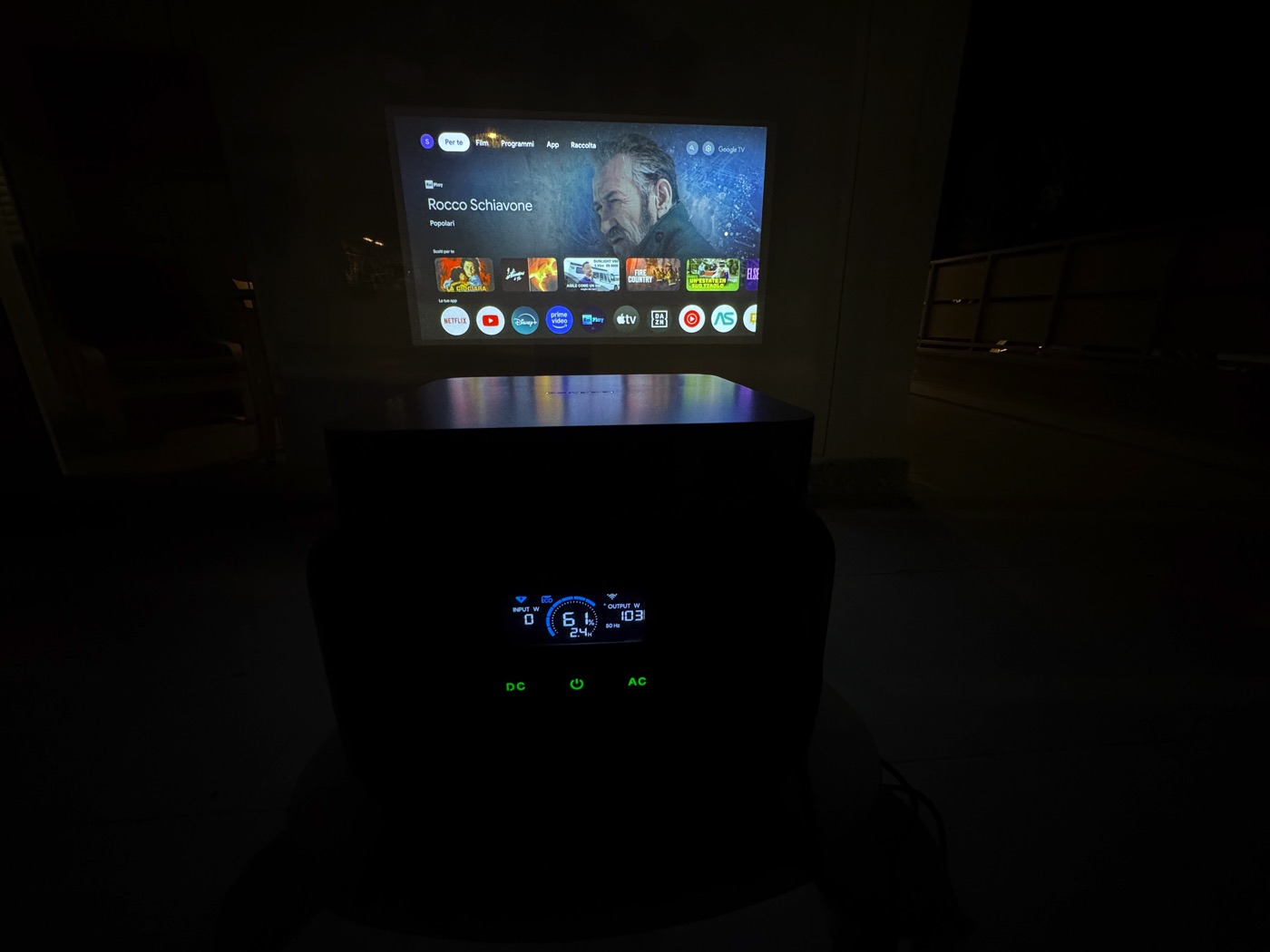 Per quanto riguarda il video abbiamo collegato un proiettore Laser Dangbei da 1200 Iso Lumen in grado di proiettare su uno schermo da 100″ e grazie ad un assorbimento più o meno continuo di 110 watt è stato in grado di gestire 3 ore e passa di proiezione.
