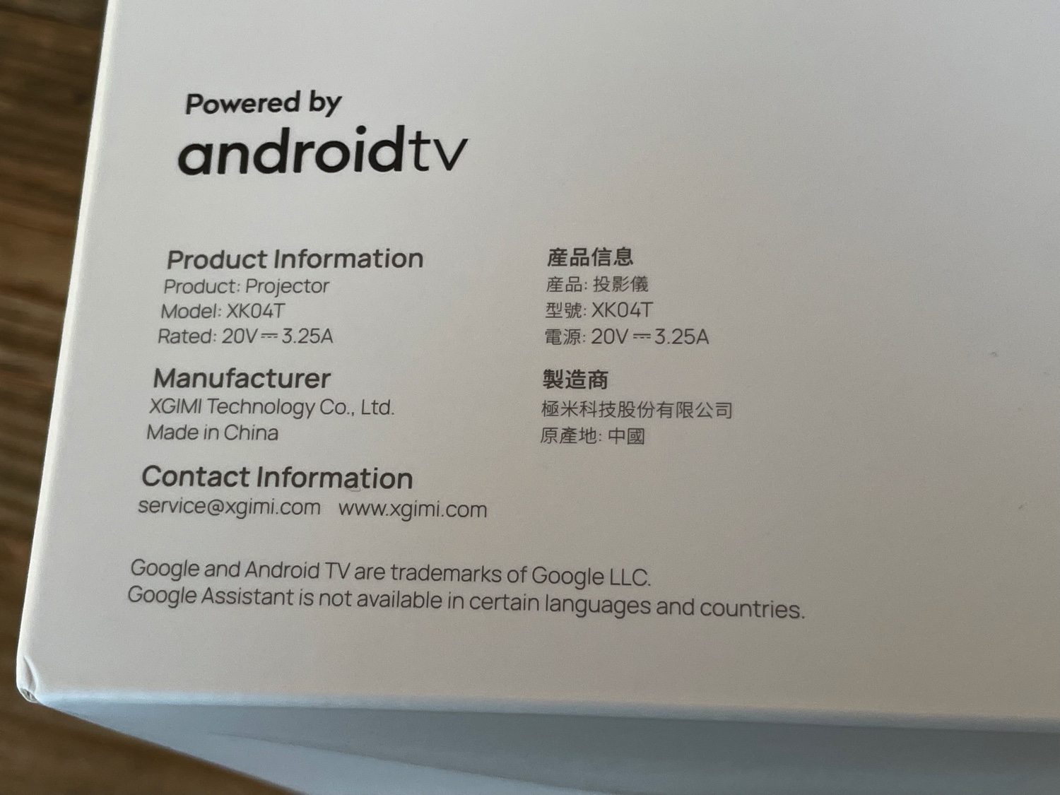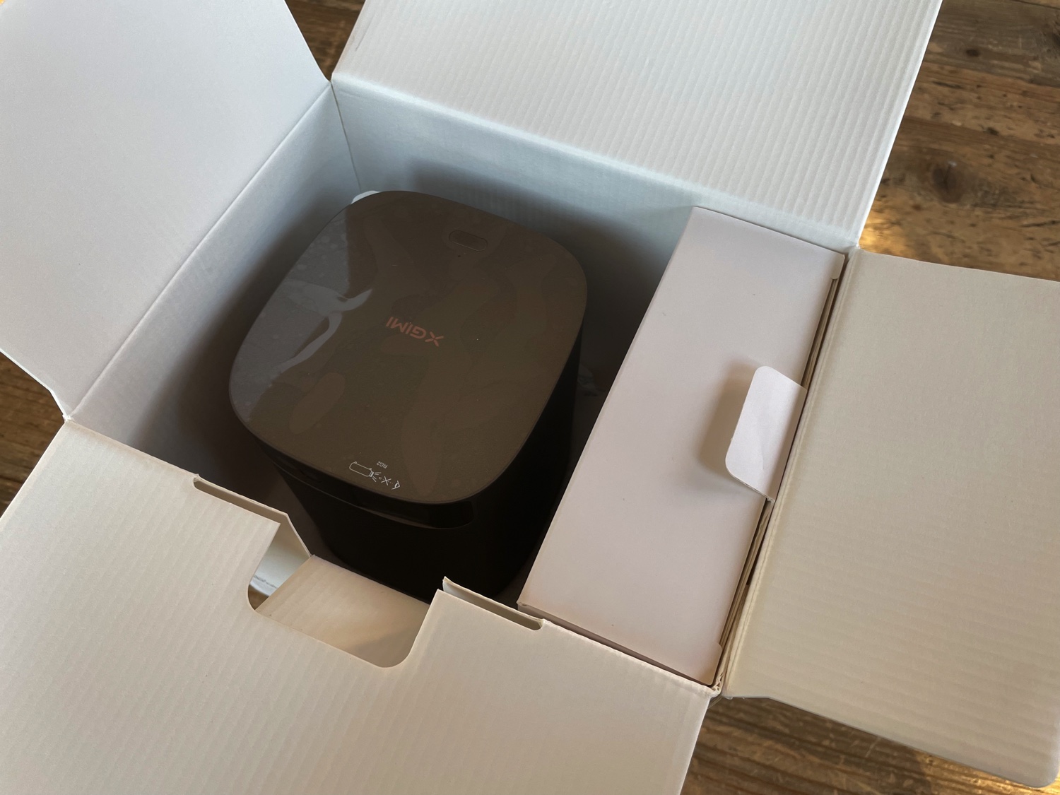 Ecco la confezione di uno dei primissimi modelli di XGIMI Mogo 2 Pro appena arrivato in italia. La scatola per lo più bianca recita le carattteristiche principali, la risoluzione, il sistema audio a bordo, la presenza di Android TV 11 e chromecast e dell’assistente Google come interfaccia vocale e pure dell’alimentazione USB-C PD.