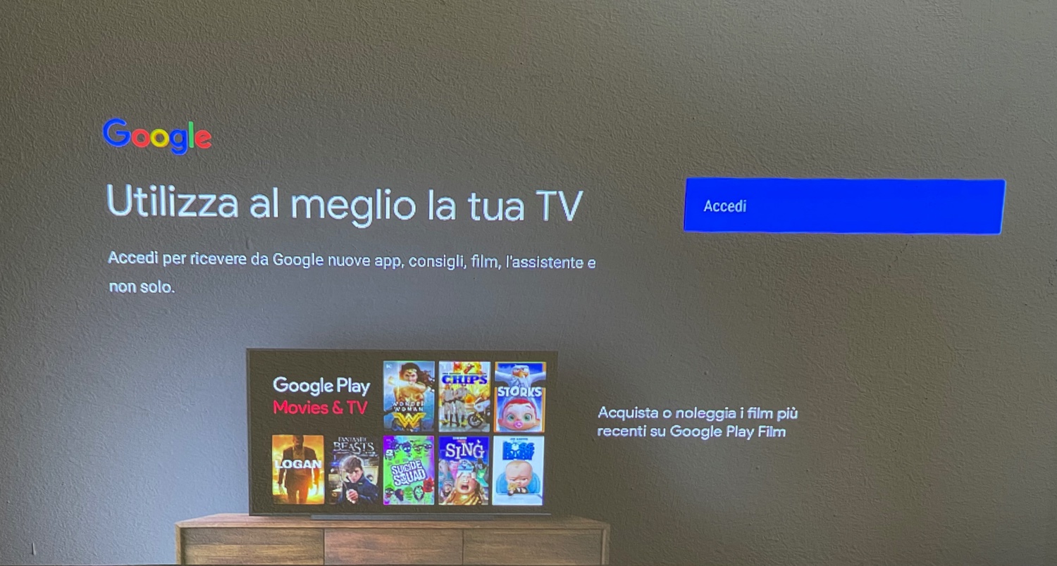 Il proiettore si può configurare velocemente abbinandolo ad un telefono Android preesistente (vi ricordiamo che è possibile anche il mirroring e la proiezione con Chromecast) ma può funzionare anche con un suo account google e può essere abbinato pure ad un iPhone con i servizi compatibili Airplay video dell’app “Magicast”.