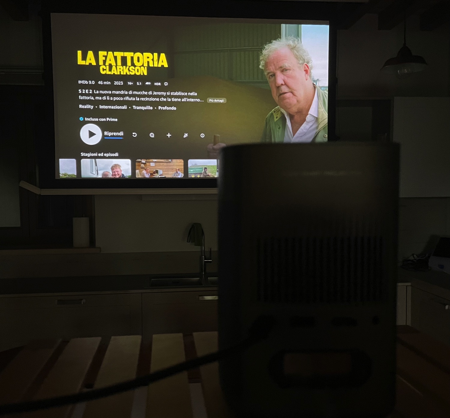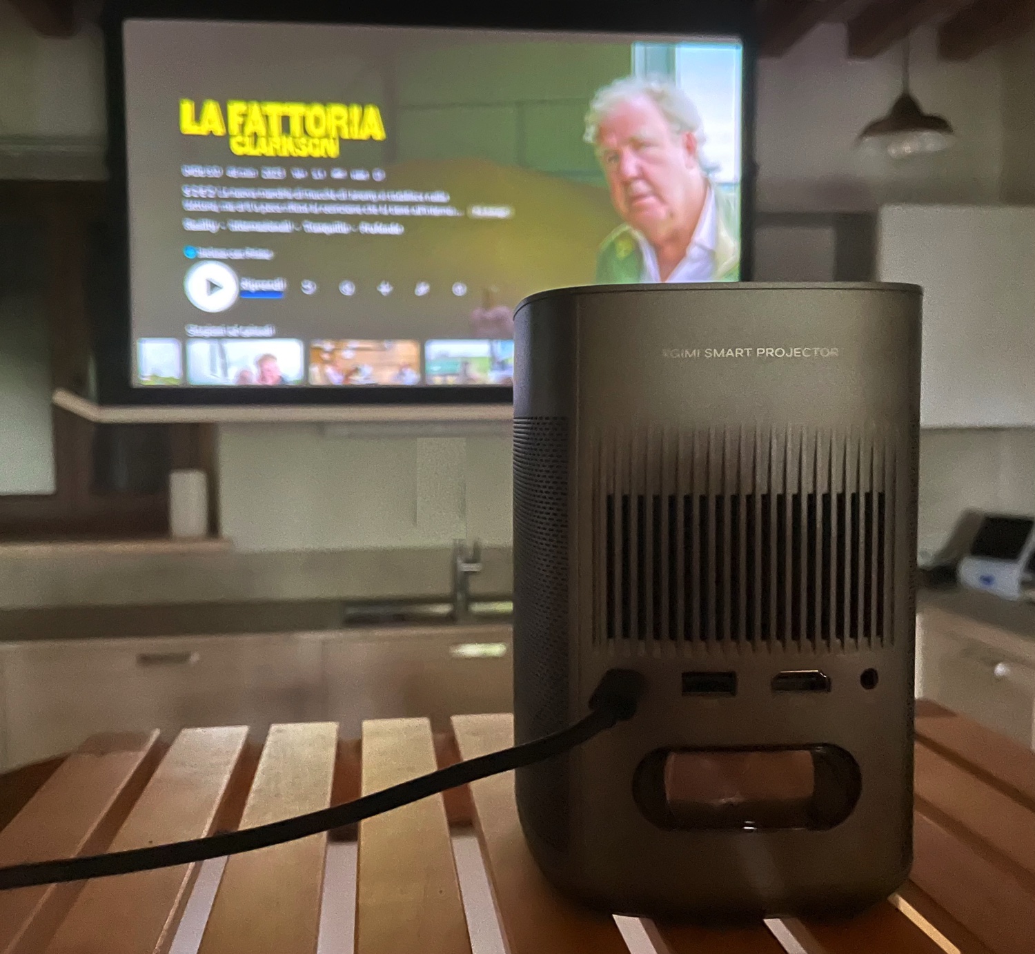 Abbiamo usato l’XGIMI in diversi ambienti e con diverse superfici di proiezione: pareti bianche dipinte a tempera con schermi finali di 120″, schermi appesi da 72″ o schermi con estensione dal basso da 80″.
