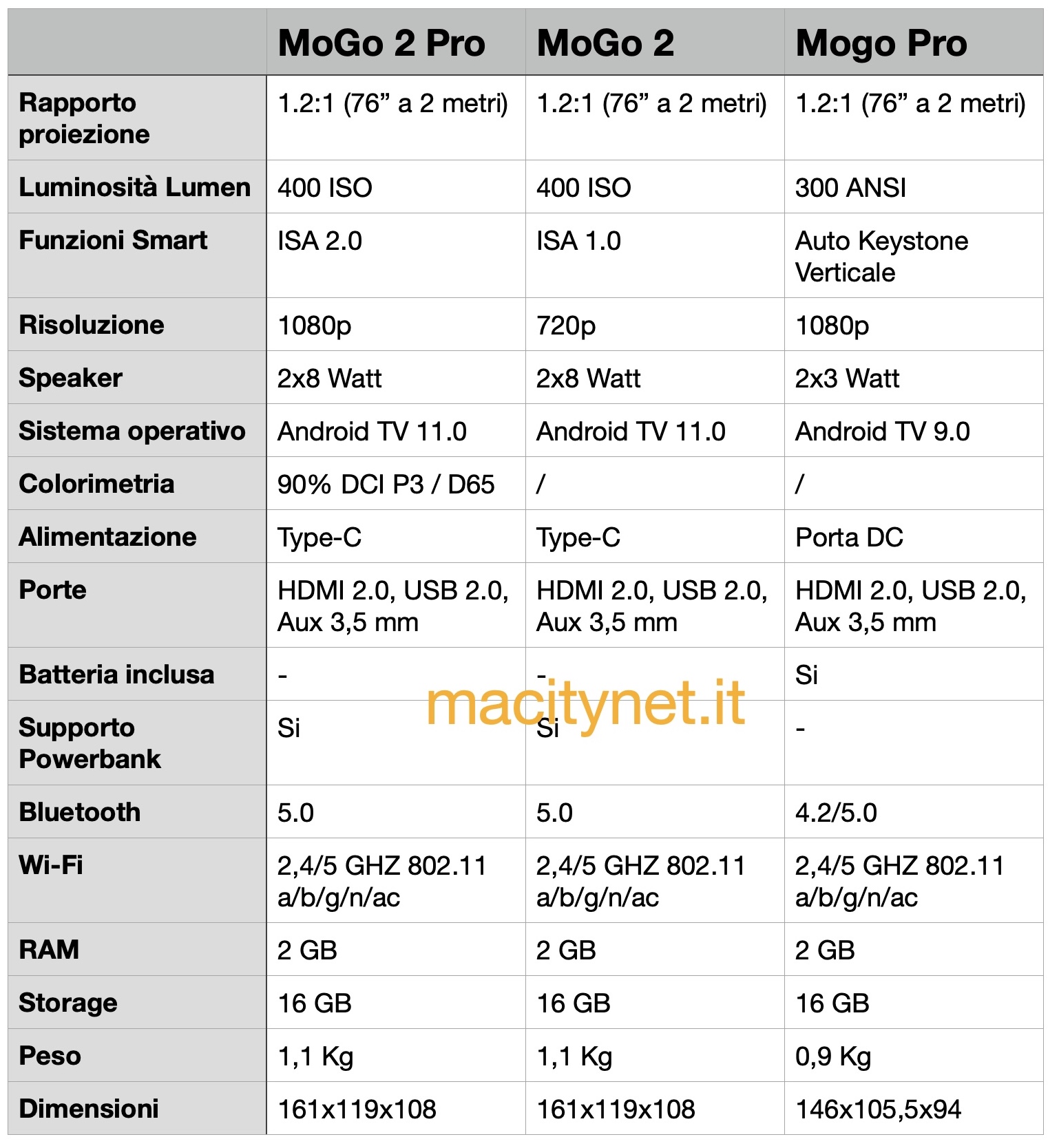 Con l’introduzione del nuovo MoGo XGIMI ha pensato anche a chi cerca un proiettore con funzionalità smart, Android recente e un buon audio ma non è così esigente sulla risoluzione anche perché proietta su schermi e superfici ridotte a vantaggio di un prezzo di accesso molto basso (399 € contro 599 € di listino). Qui sotto trovate una tabella che mostra le differenze tra i due modelli e il MoGo della precedente generazione che in realtà per livello di dotazione smart è praticamente di 2 generazioni fa.