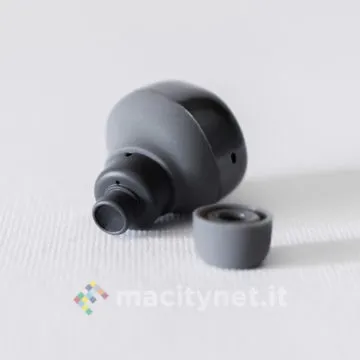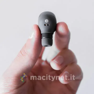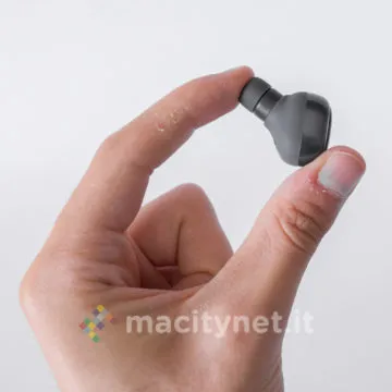 La parte esterna è in plastica lucida di colore grigio metalizzato, mentre quella interna è coperta da una sottile gommatura di una tonalità di grigio più chiara che garantisce un’ottima aderenza dell’auricolare all’orecchio: non essendoci un’aletta interna o un archetto esterno, qui l’unico modo per assicurare stabilità a ciascun auricolare risiede in questa gommatura combinata con il giusto gommino in-ear, disponibile in confezione in tre diverse misure per meglio adattarlo a qualsiasi conformazione della cavità auricolare.