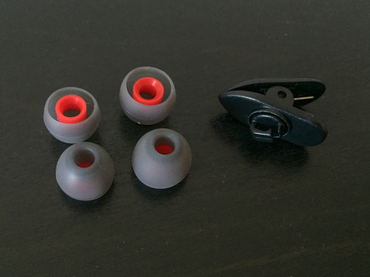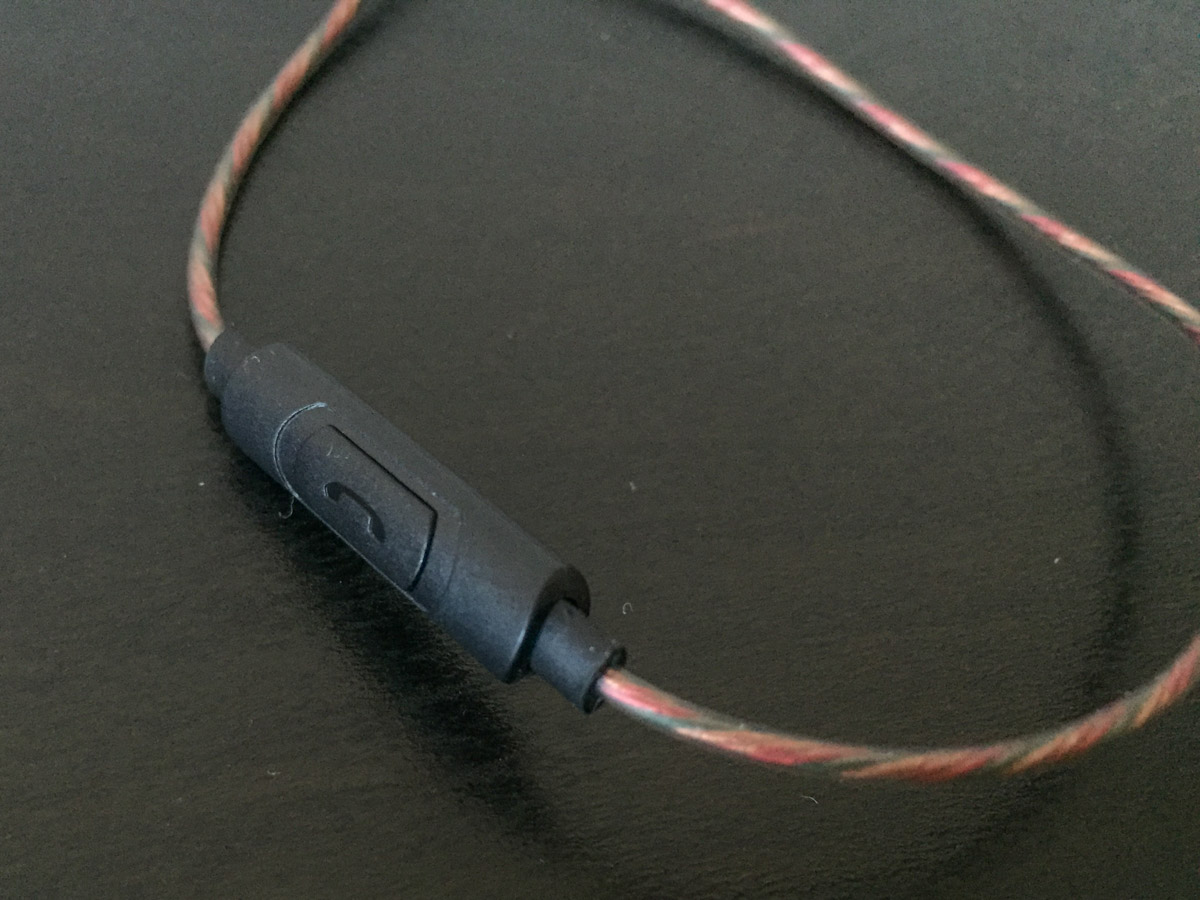 Lungo il cavo dell’auricolare destro (quest’ultimo riconoscibile dalla cerchiatura rossa, il sinistro è cerchiato in blu) è presente una clip in plastica satinata nera sulla quale è incassato il foro per il microfono da una parte e il pulsante multifunzione (contrassegnato dall’icona di una cornetta telefonica) dall’altra.