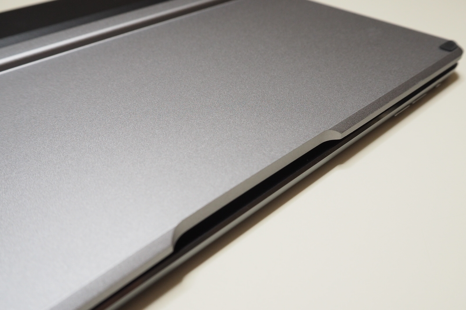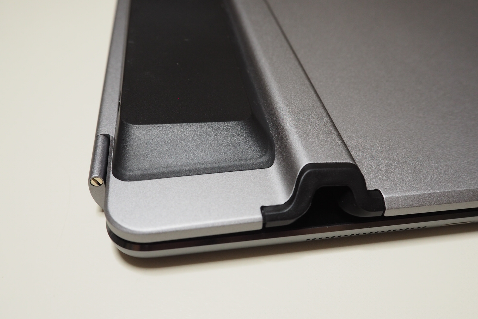 La QODE Thin Type una volta “installata” appare un prodotto di livello pari quello dei suoi materiali. È più sottile dell’iPad (anche se sul retro troviamo un rigonfiamento che contiene la batteria, utile ad dare alla tastiera una inclinazione utile ad una miglior velocità di scrittura) e ospita in maniera molto stabile l’iPad. Anche messo il tablet in posizione ritratto non si ha mai la sensazione che possa ribaltarsi per il baricentro fuori asse. Quando la useremo come cover, avremo tra le mani un prodotto con un look in un tempo futurista, minimalista ed elegante grazie a materiali scelti accuratamente; l’alluminio della tastiera che abbiamo provato è della stessa tinta del grigio siderale dell’iPad Air e si abbina alla perfezione, nonostante sia al tatto leggermente più ruvido. Dal punto di vista del fattore di forma, per peso ed ingombro non sarà facile per la concorrenza fare di meglio: la tastiera pesa solo 350 grammi, meno dell’iPad Air stesso (469 grammi). Insieme avremo quindi un peso di circa 850 grammi, non un peso piuma, ma sempre un paio di etti (quindi un 20%) meno di un MacBook Air da 11 pollici. iPad e tastiera insieme sono spessi circa 1,2 centimetri nel punto minimo che diventano circa 1,7 nel punto dove troveremo il rigonfiamento per la batteria.