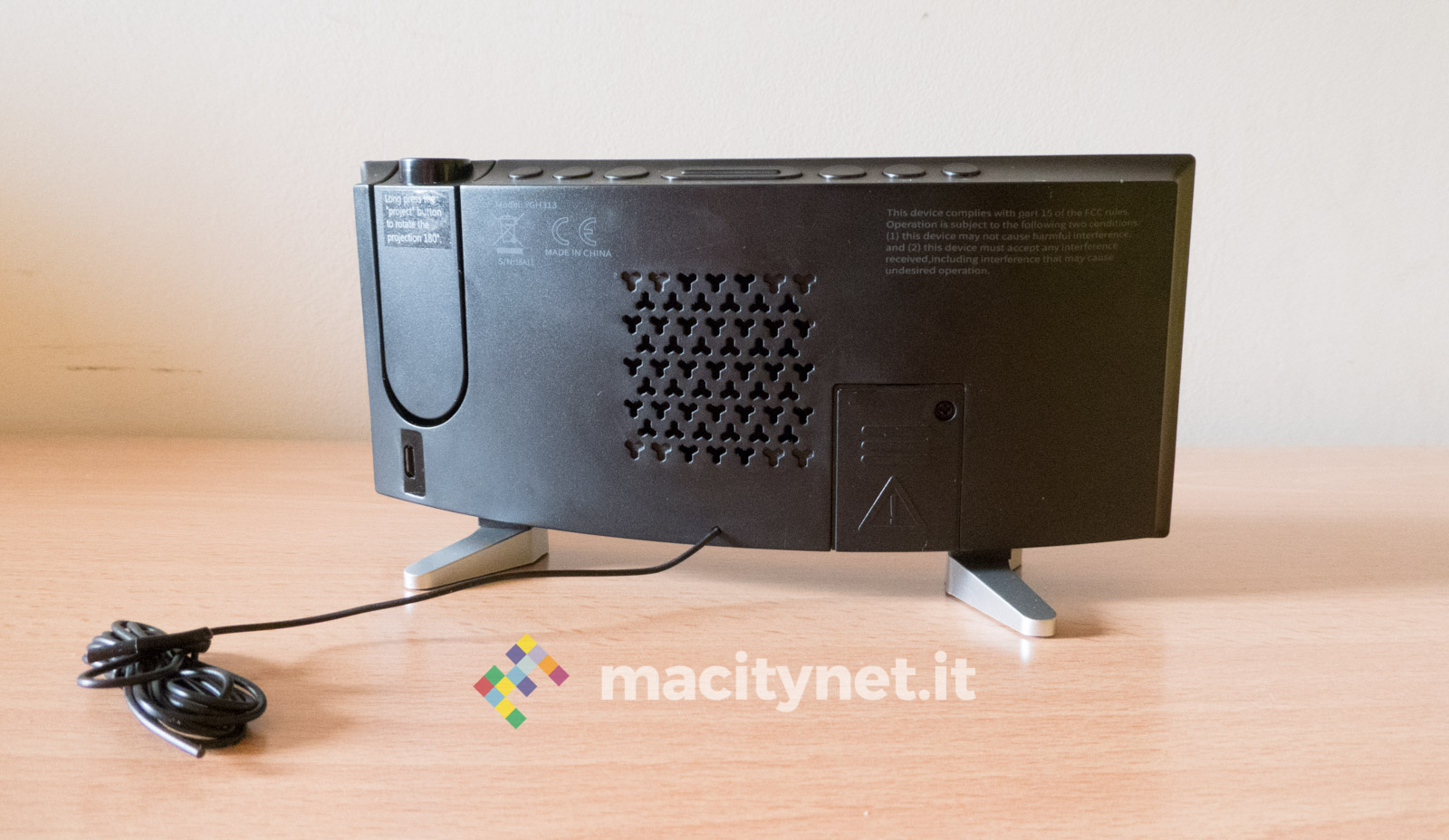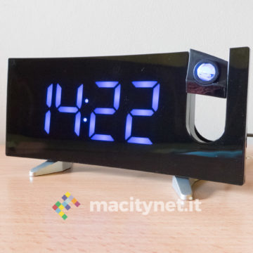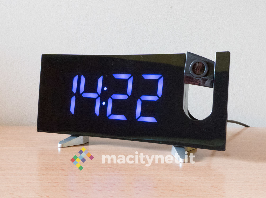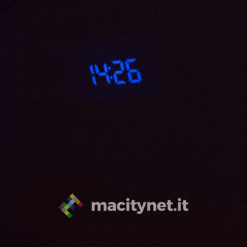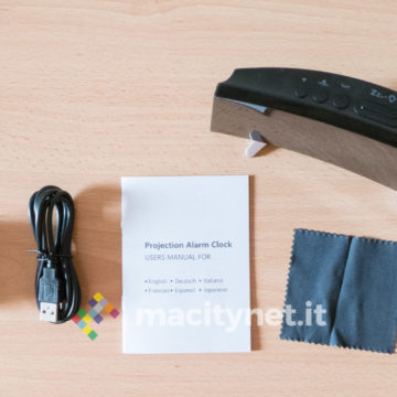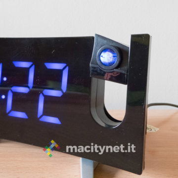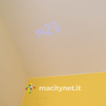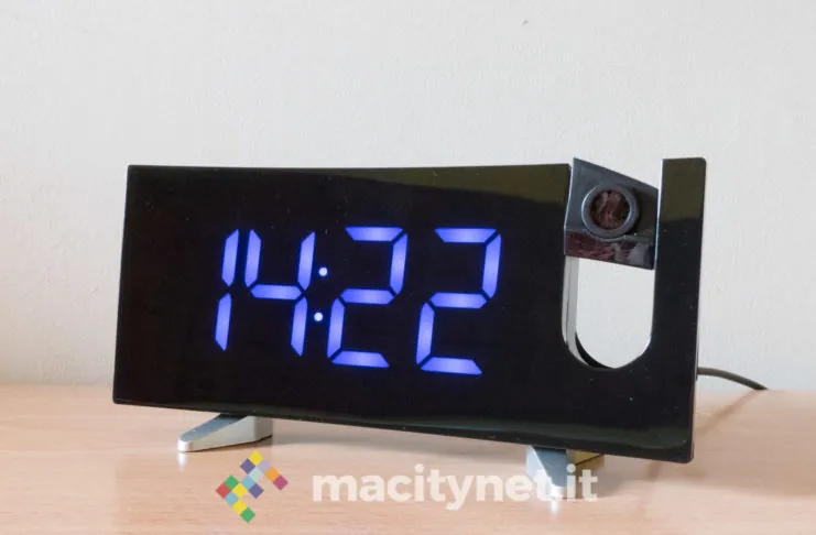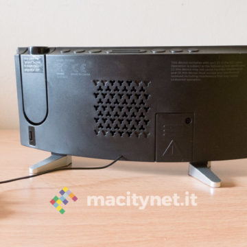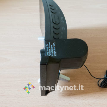 In quest’ottica ci è piaciuto anche poter regolare la luminosità del display e del proiettore: ci sono quattro diversi livelli di luminosità per l’ora mostrata sullo schermo ed è possibile anche spegnerlo completamente per restare al buio più completo, magari proiettando l’ora soltanto sul soffitto. Per quest’ultima ci sono due diversi livelli di intensità luminosa, il più alto risulta ottimamente leggibile soprattutto al buio e risulta debolmente visibile anche in pieno giorno. In passato abbiamo avuto radiosveglie simili che però erano deboli proprio nel proiettore, incapace di assicurare un’ottima visibilità dell’ora proiettata sul soffitto o su una parete.