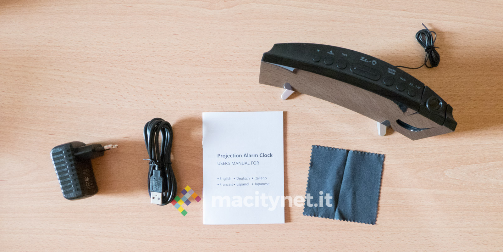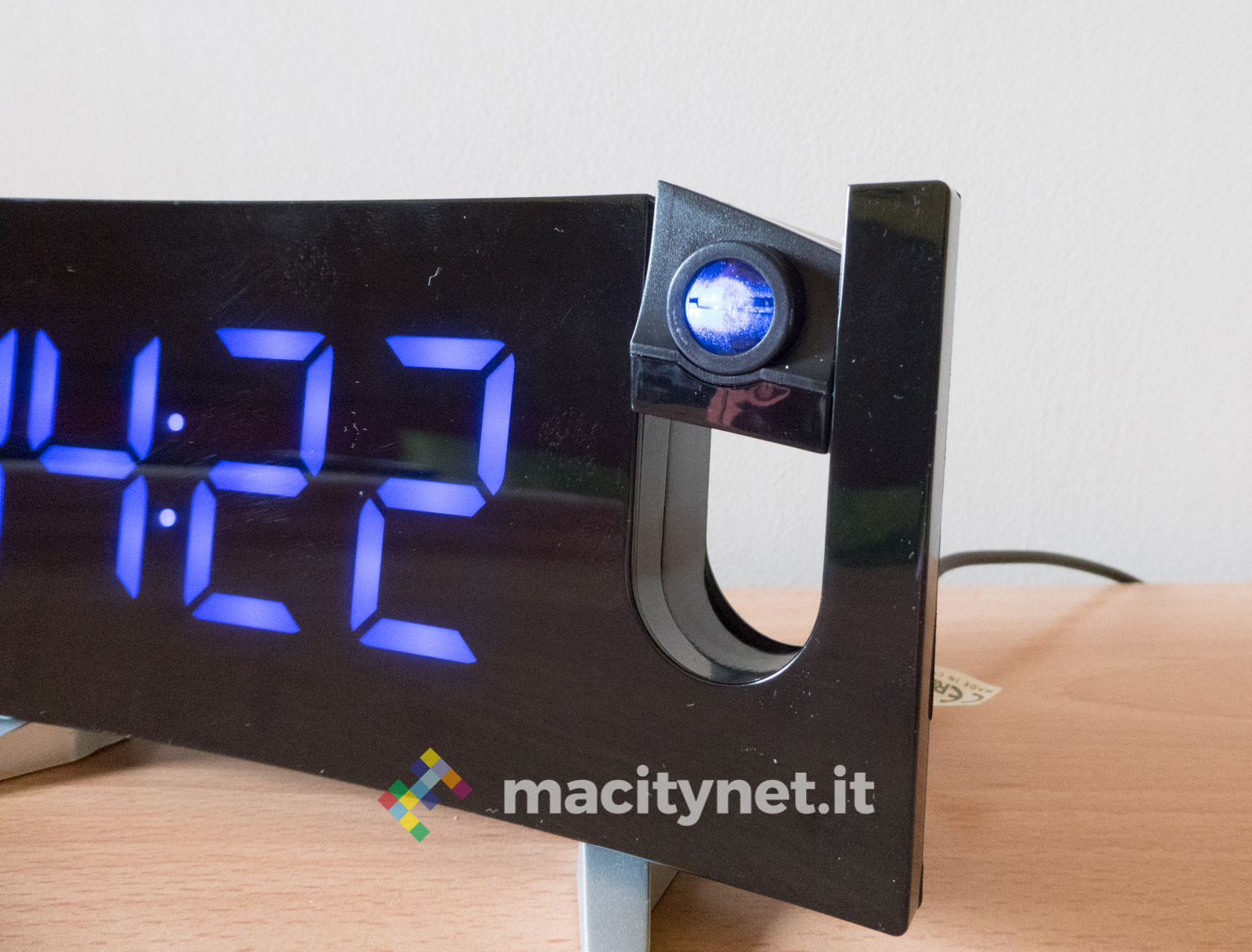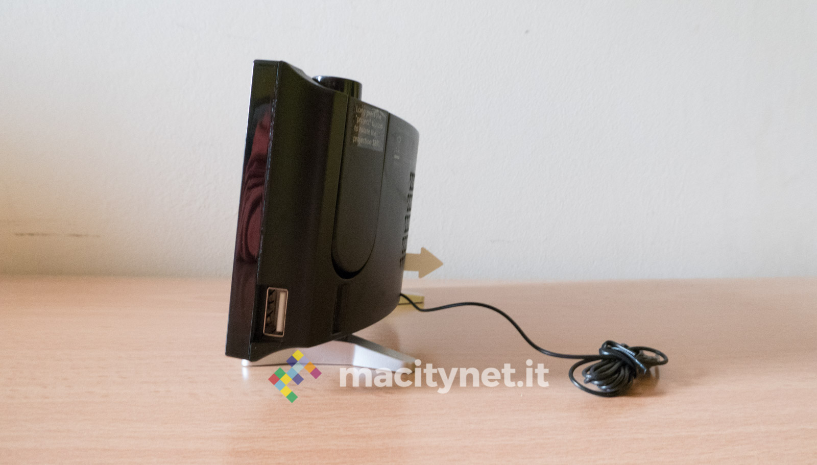 In quest’ottica ci è piaciuto anche poter regolare la luminosità del display e del proiettore: ci sono quattro diversi livelli di luminosità per l’ora mostrata sullo schermo ed è possibile anche spegnerlo completamente per restare al buio più completo, magari proiettando l’ora soltanto sul soffitto. Per quest’ultima ci sono due diversi livelli di intensità luminosa, il più alto risulta ottimamente leggibile soprattutto al buio e risulta debolmente visibile anche in pieno giorno. In passato abbiamo avuto radiosveglie simili che però erano deboli proprio nel proiettore, incapace di assicurare un’ottima visibilità dell’ora proiettata sul soffitto o su una parete.