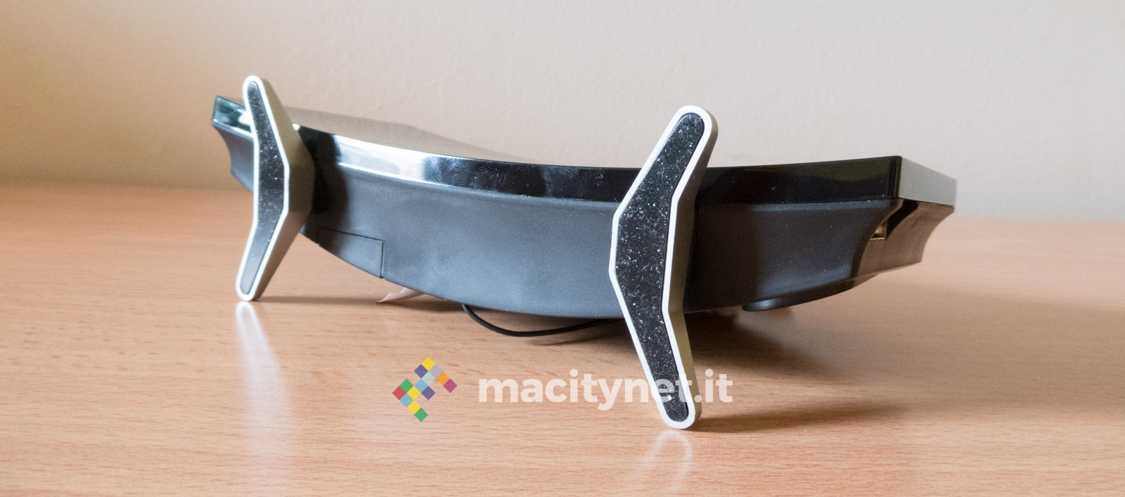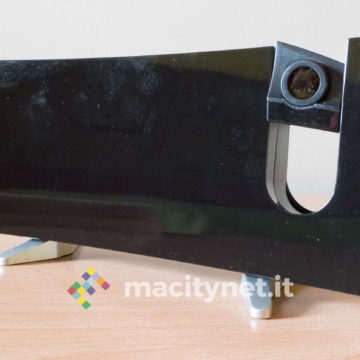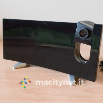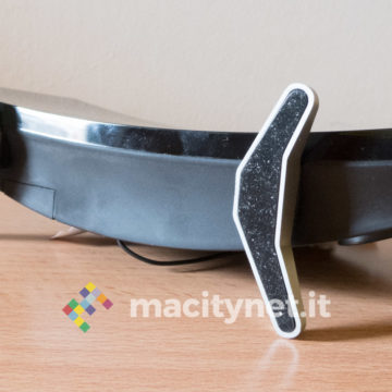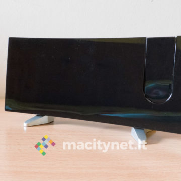 E’ realizzata in policarbonato molto leggero ma robusto: completamente nera, la facciata frontale è lucida mentre i piedini sono accompagnati da una copertura in gomma che si è rivelata essere una calamita per sporco e polvere. Sul lato posteriore c’è l’altoparlante per radio e sveglia, affiancato da un coperchio che accoglie una batteria a bottone CR2032 necessaria per mantenere le impostazioni in assenza (anche temporanea) di corrente e all’ingresso microUSB per l’alimentazione (può quindi funzionare anche con un powerbank). Sporge anche il cavo dell’antenna, utile per garantire un’ottima ricezione della radio FM incorporata.