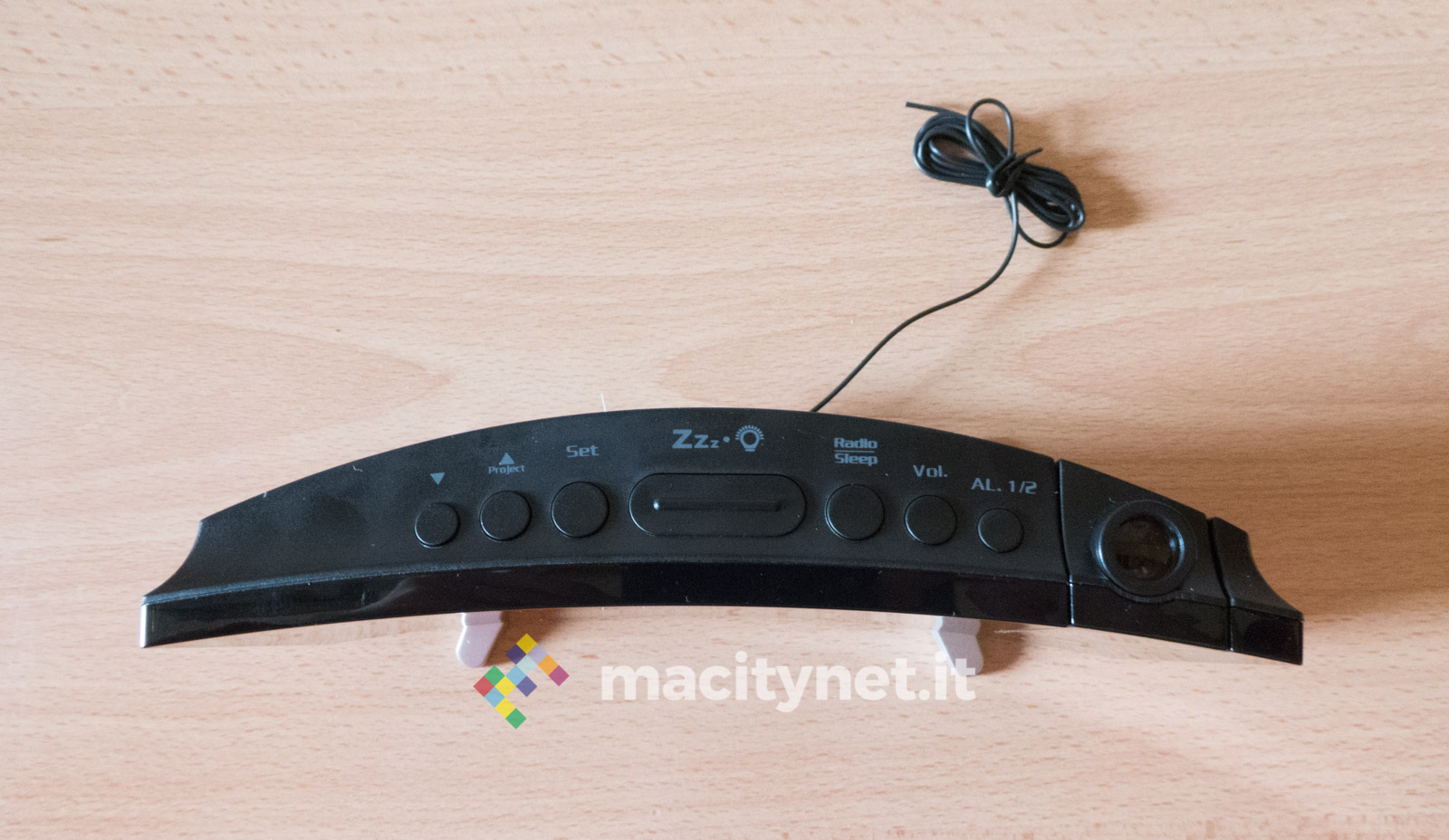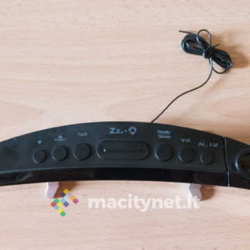 Sul lato superiore ci sono invece i pulsanti per il controllo delle impostazioni: nello specifico, da sinistra verso destra troviamo i tasti “Giù” e “Su”, quest’ultimo utilizzato anche per accendere il proiettore; segue poi il tasto “Set”, il pulsante “Snooze” e poi ancora i tasti “Sleep/Radio”, “Volume” e “Allarme”.