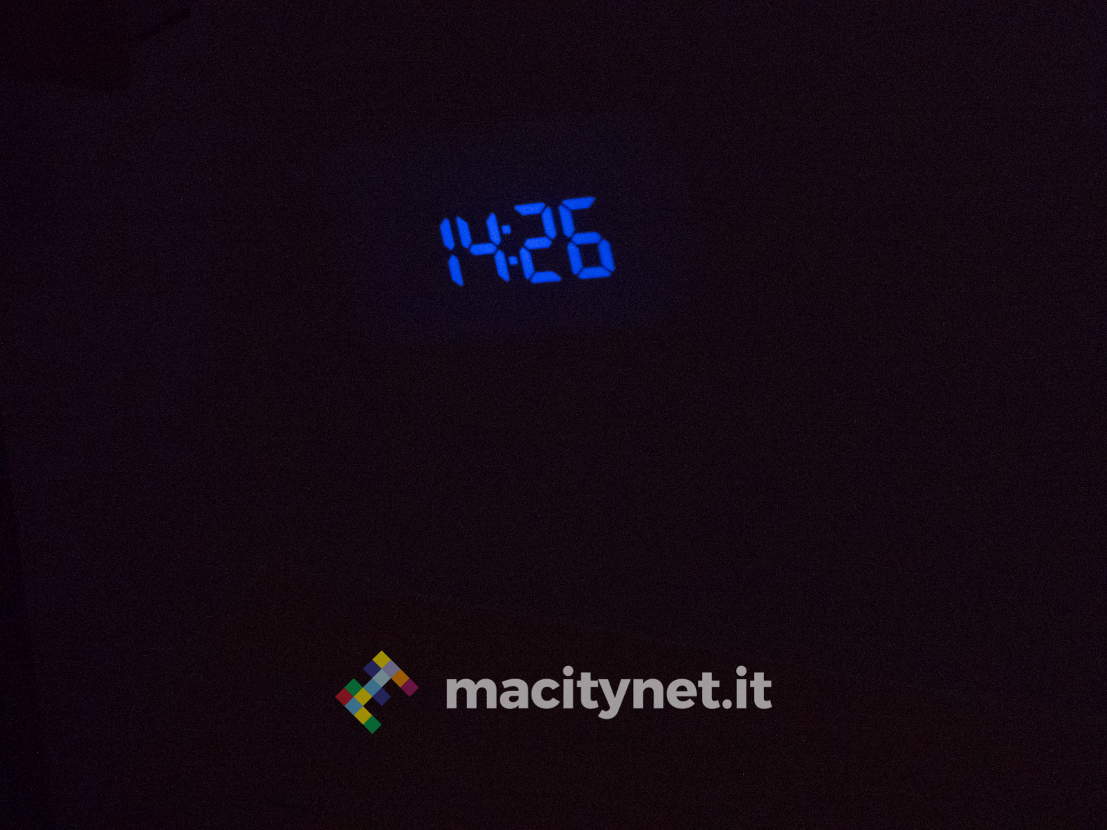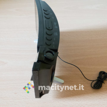 Il display è molto ampio e l’ora mostrata copre gran parte della superficie a disposizione. Nel nostro caso è di colore blu, ma è in vendita anche lo stesso modello con il display nella variante di colore rosso. Completa il cerchio delle funzioni l’uscita USB posizionata sul bordo destro della radiosveglia.