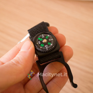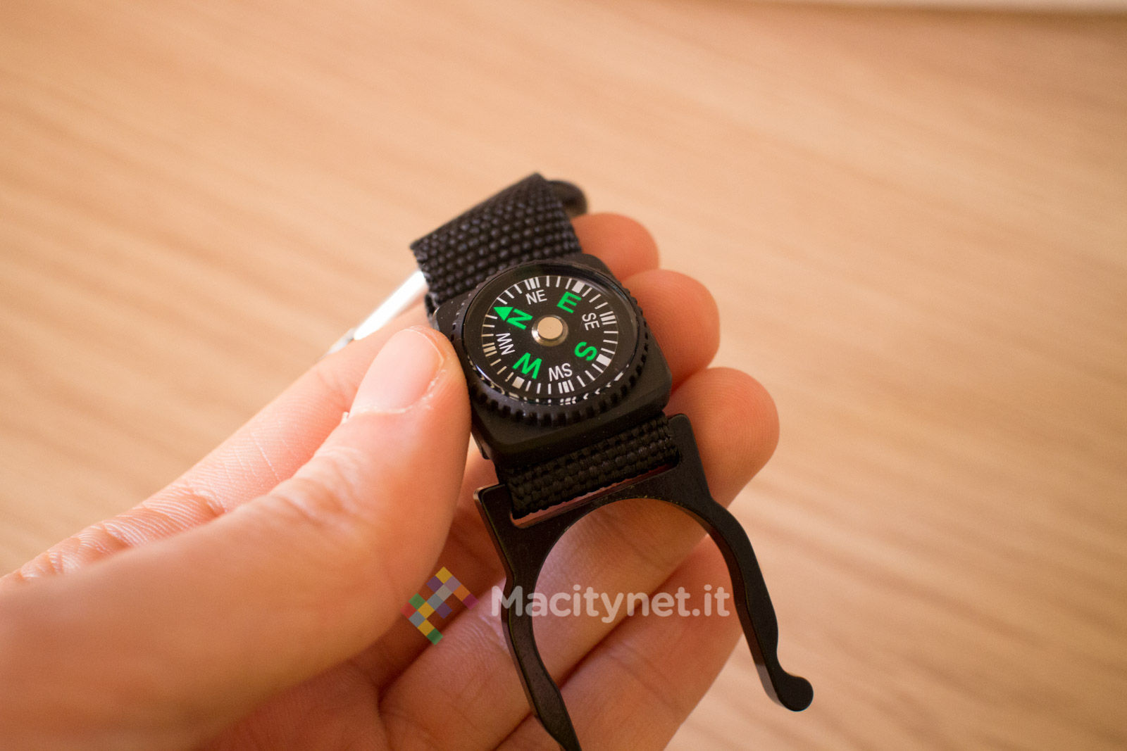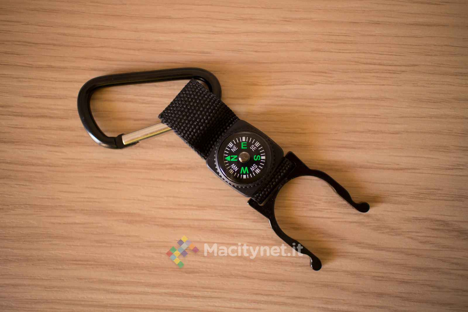 Sul bordo superiore la cornice si solleva creando un ampio foro, morbido e flessibile sul lato più sottile, una scelta che facilita l’aggancio della batteria, attraverso il moschettone incluso nella confezione, ad un anello dello zaino o alla cintura dei pantaloni. A proposito di accessori nella scatola, oltre al moschettone abbiamo trovato una fascetta in nylon con una sorta di gancio metallico ed una piccola bussola : come scoperto grazie ad una immagine pubblicitaria è a misura del collo di una bottiglia in plastica, quindi utile per agganciarla allo spallaccio di uno zaino e trasportarla con facilità. Si tratta di un piccolo gadget che ha poco a che fare con la batteria (ma fa comodo nelle situazioni dove quest’ultima verrà impiegata) ma potrebbe essere gradito a qualche particolare categoria di utenza.