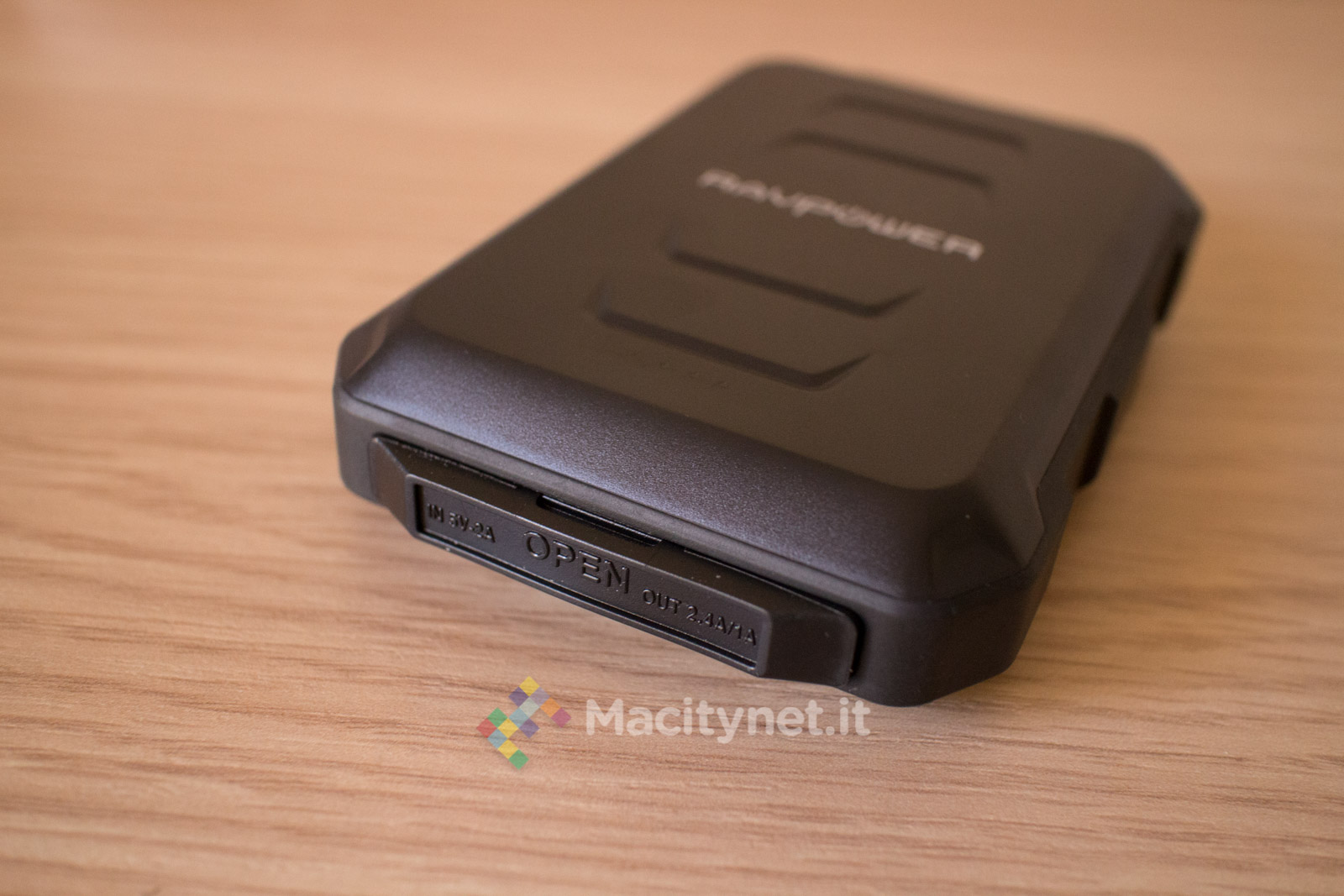 Sul lato basso troviamo il pulsante ON/OFF che permette di accendere i 4 LED frontali (ciascuno rappresenta il 25% di energia residua nella batteria), attivare la ricarica dei dispositivi collegati ed accendere la torcia, posizionato sulla base e coperta da un coperchio impermeabile che protegge anche l’ingresso microUSB e le due uscite USB.