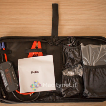 La batteria viene venduta all’interno di una valigetta semi-rigida in tessuto dove trovano posto anche i cavetti con tanto di pinze per il collegamento alla batteria dell’auto, due cavi microUSB di diverse lunghezze, un caricatore da muro ed uno con spina accendisigari per ricaricare la batteria in viaggio.