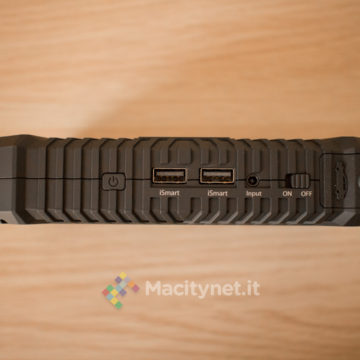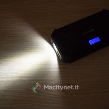 Detto ciò la batteria appare molto robusta fin dalla prima occhiata, e le sensazioni vengono confermate dal contatto fisico con lo chassis, in robusta plastica con copertura gommata la cui presa viene ulteriormente migliorata dalle scanalature ai bordi. Da un lato corto trova posto una torcia LED, sul lato lungo invece figurano le due prese USB, l’ingresso per l’alimentazione, l’interruttore ON/OFF, un pulsante e l’attacco per la cavetteria, protetto da un coperchio in gomma riconoscibile dal simbolo dell’automobile in rilievo. Per finire sul lato superiore c’è un piccolo display LCD retroilluminato (luce blu acceso) che mostra la percentuale di energia residua nella batteria e qualche altra informazione utile durante l’uso della batteria.