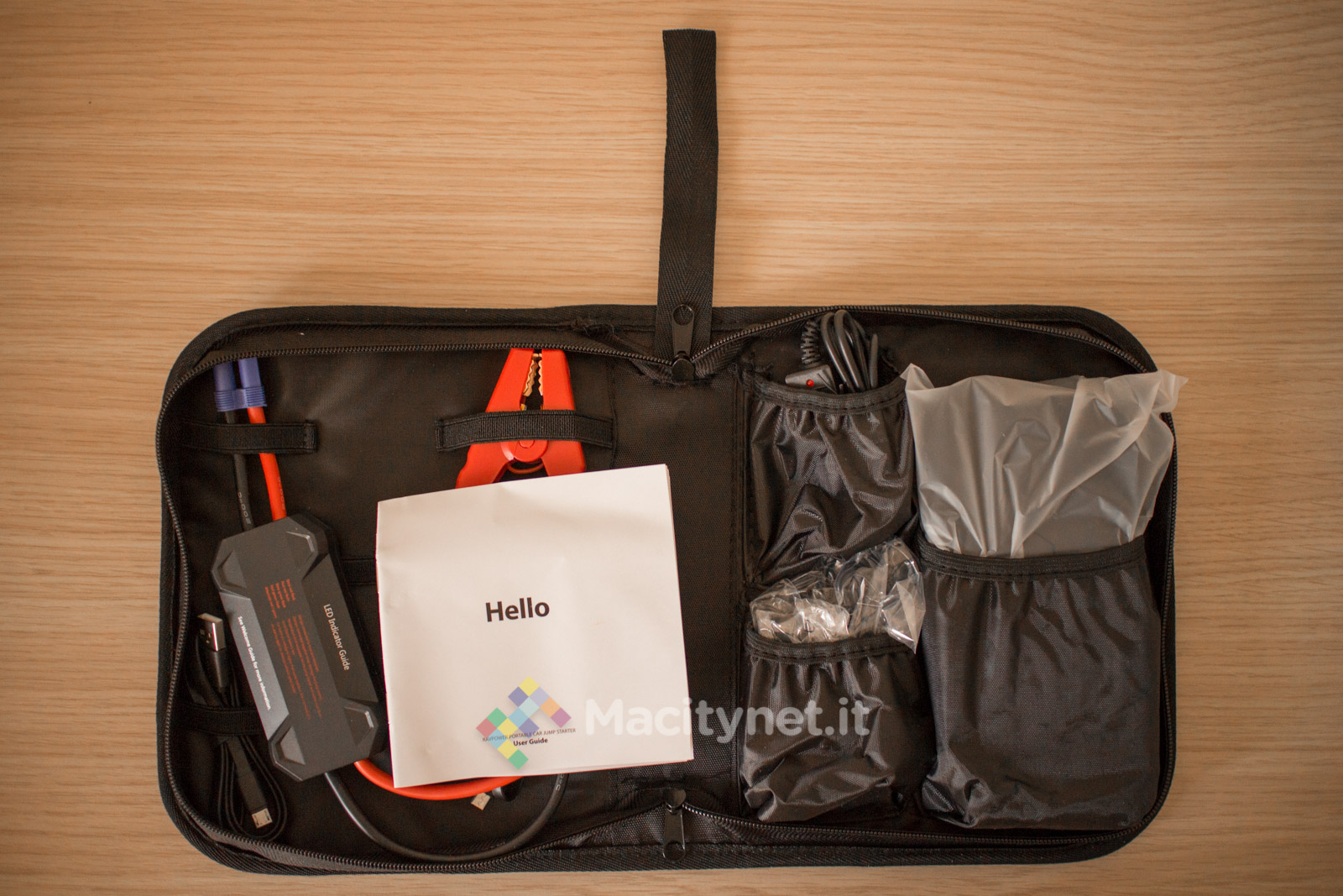 La batteria viene venduta all’interno di una valigetta semi-rigida in tessuto dove trovano posto anche i cavetti con tanto di pinze per il collegamento alla batteria dell’auto, due cavi microUSB di diverse lunghezze, un caricatore da muro ed uno con spina accendisigari per ricaricare la batteria in viaggio.