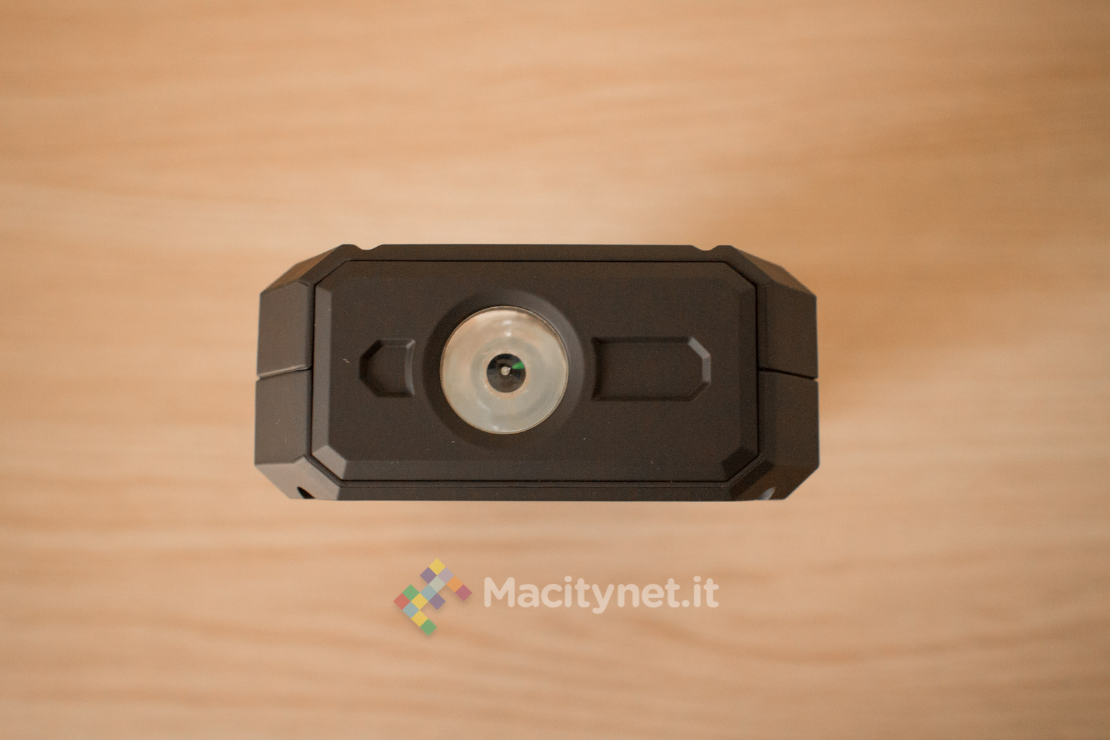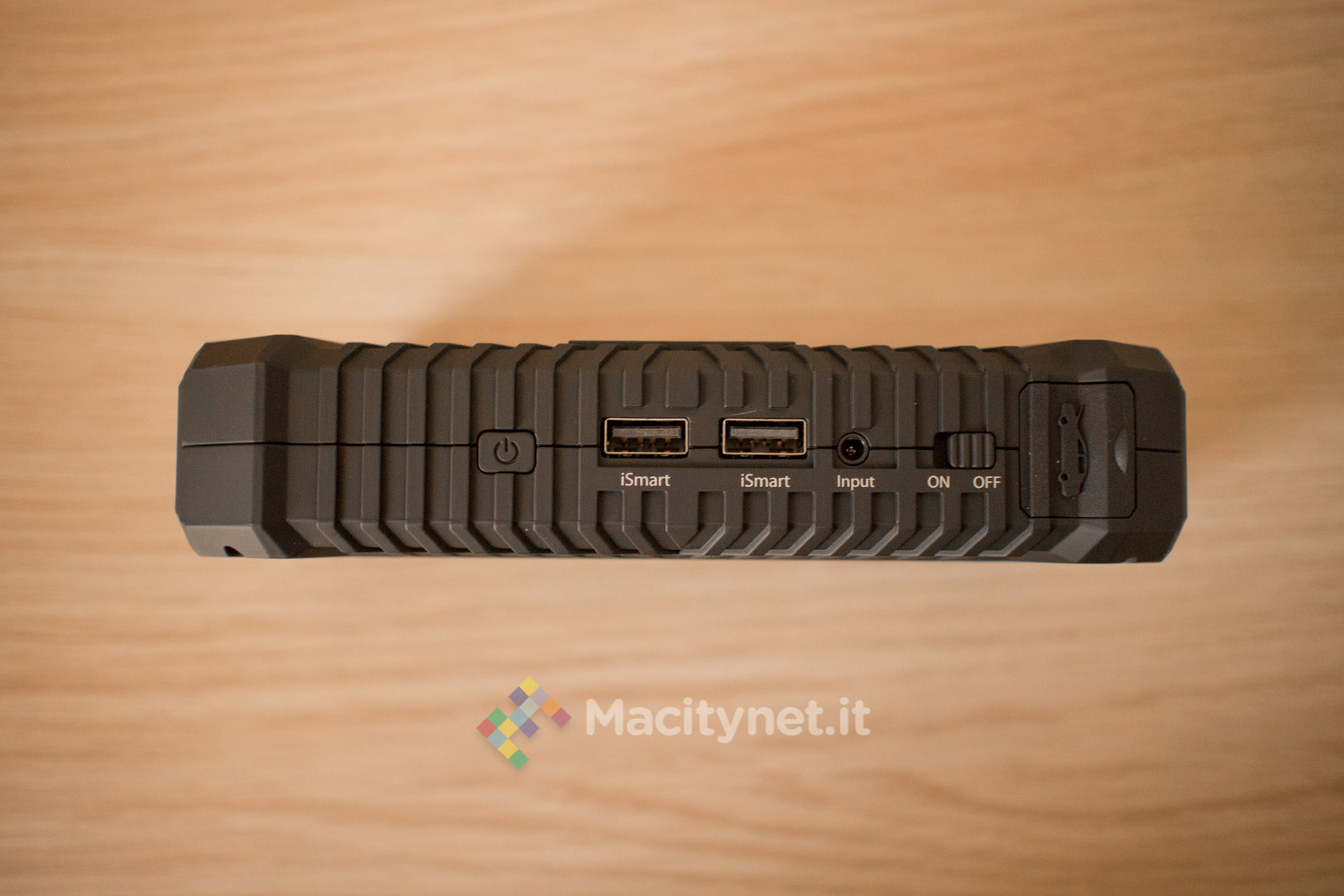 Detto ciò la batteria appare molto robusta fin dalla prima occhiata, e le sensazioni vengono confermate dal contatto fisico con lo chassis, in robusta plastica con copertura gommata la cui presa viene ulteriormente migliorata dalle scanalature ai bordi. Da un lato corto trova posto una torcia LED, sul lato lungo invece figurano le due prese USB, l’ingresso per l’alimentazione, l’interruttore ON/OFF, un pulsante e l’attacco per la cavetteria, protetto da un coperchio in gomma riconoscibile dal simbolo dell’automobile in rilievo. Per finire sul lato superiore c’è un piccolo display LCD retroilluminato (luce blu acceso) che mostra la percentuale di energia residua nella batteria e qualche altra informazione utile durante l’uso della batteria.
