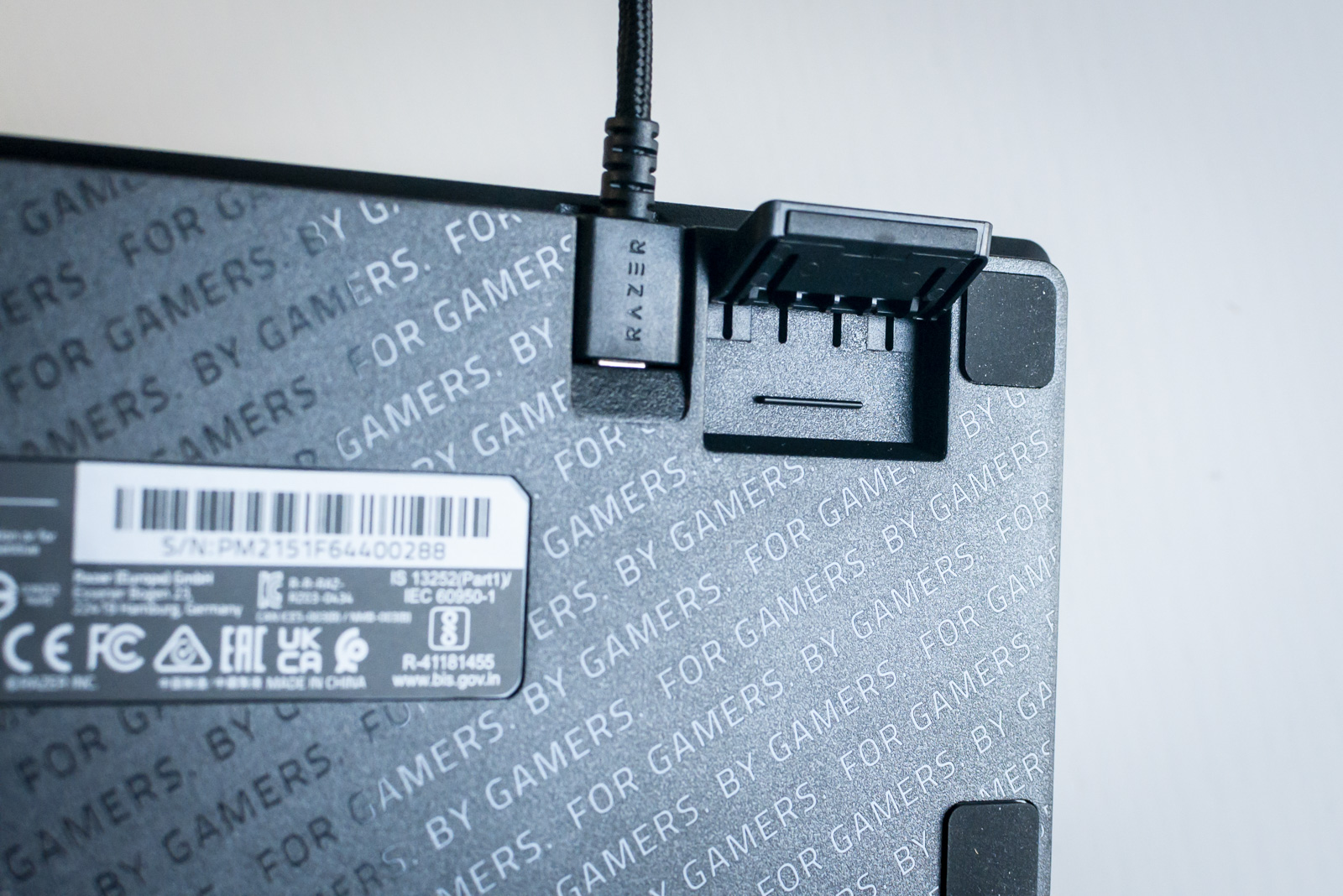 La superficie esterna è realizzata in plastica, con una buona serigrafia nella parete sottostante che riporta il logo Razer. Nella scatola trova posto la tastiera, un piccolo libretto di benvenuto e appunto il cavo standard, ma per chi lo desidera è disponibile un poggiapolsi comodo in gomma soffice (acquistabile a parte).